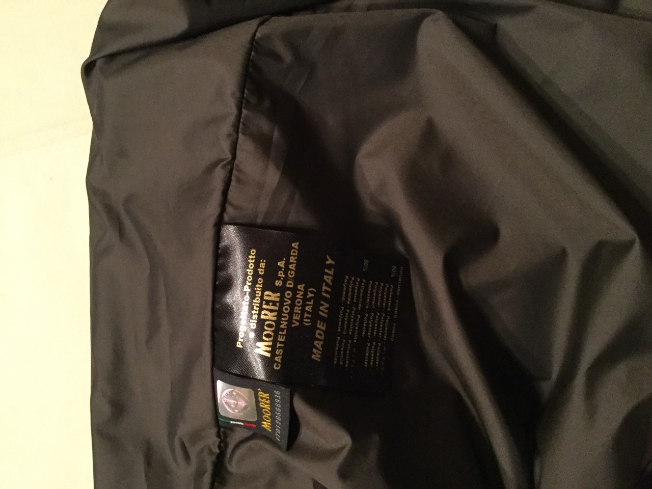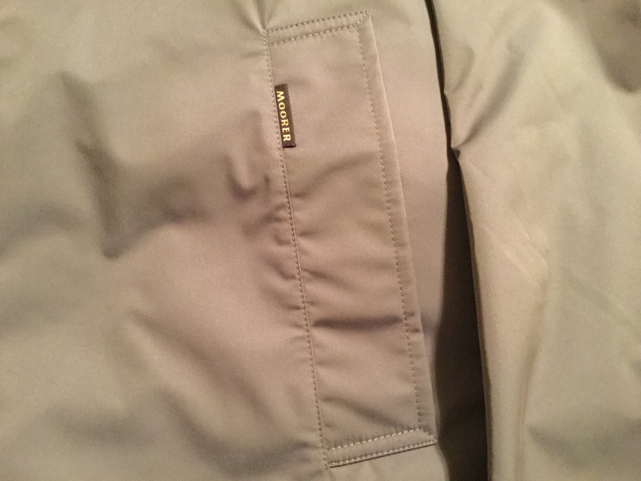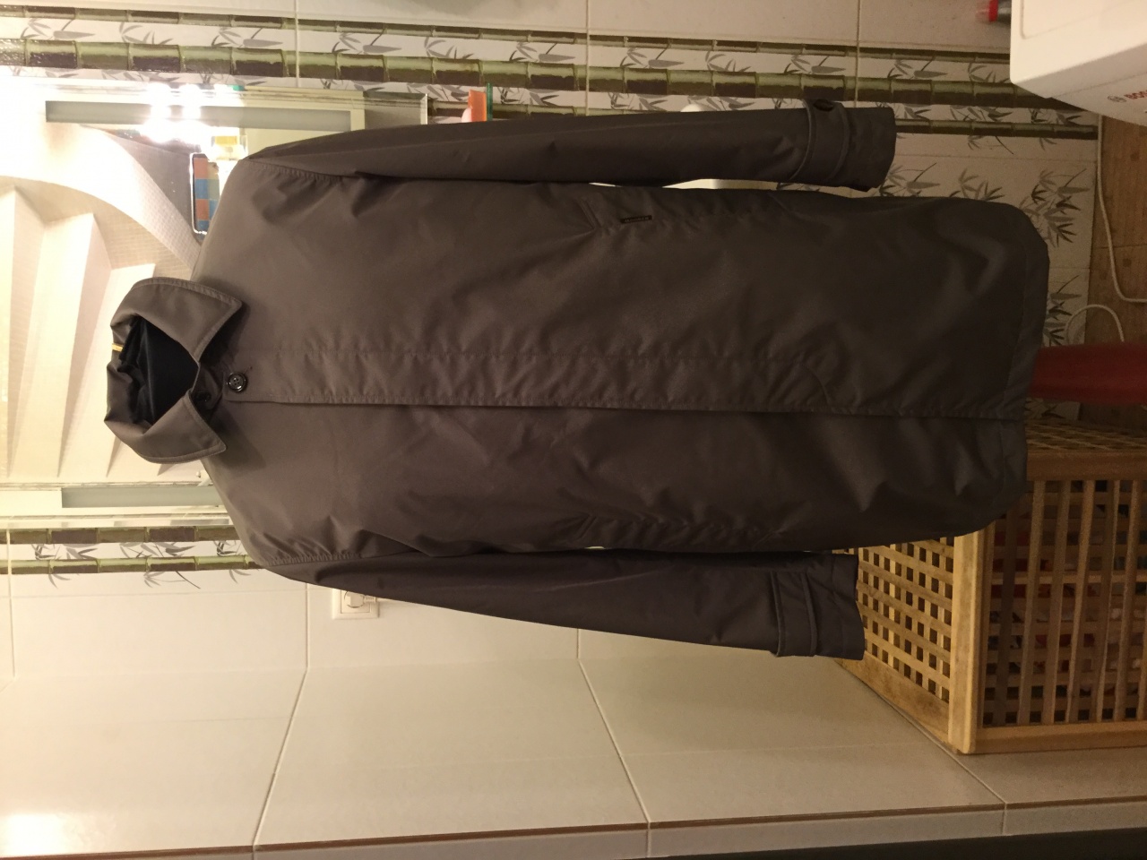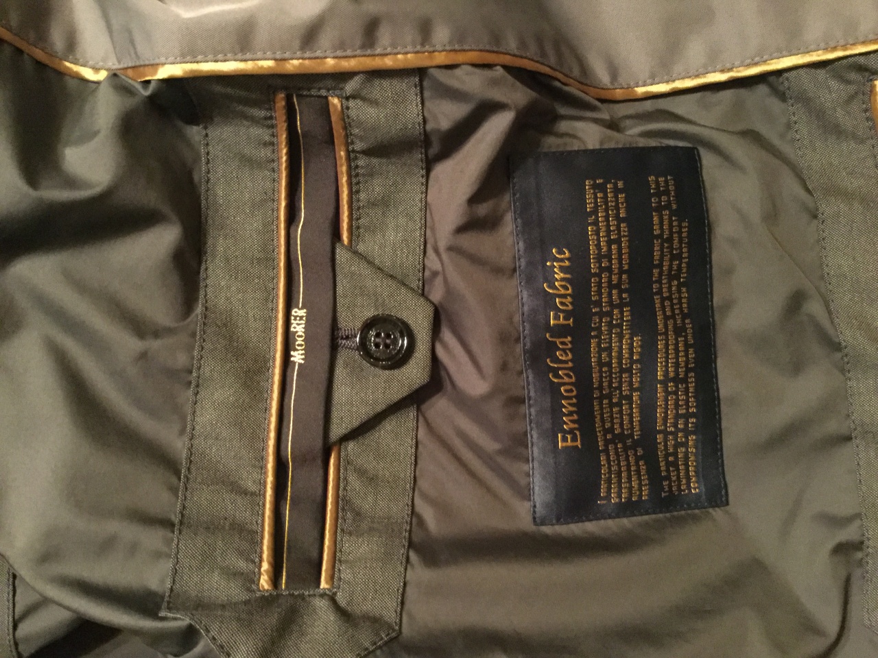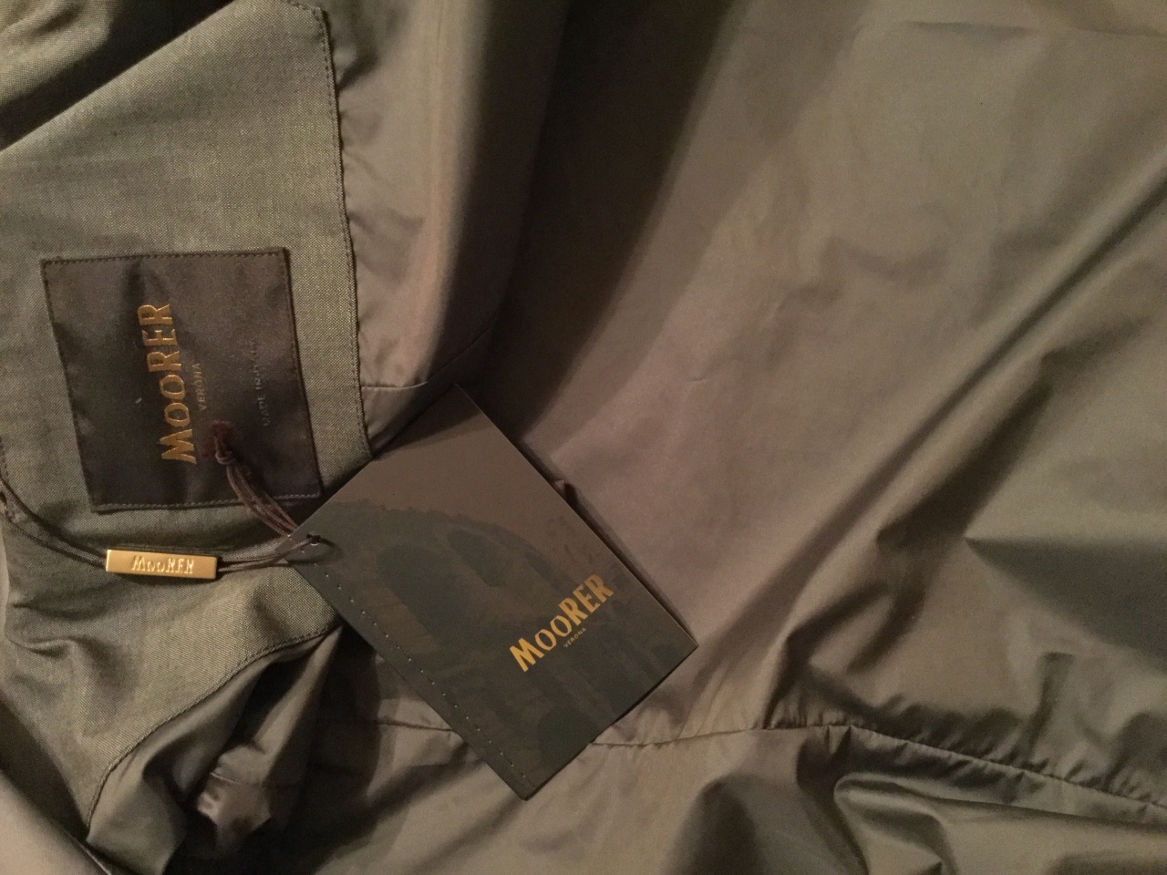 MOORER.Превосходного исполнения,темно-оливкового цвета,выполнен из водоотталкивающей ткани с контрастной подкладкой ,потайными пуговицами и прорезными карманами,манжеты рукавов на пуговицах.Имеет внутренние карманы на молниях,все пуговицы с логотипом бренда.