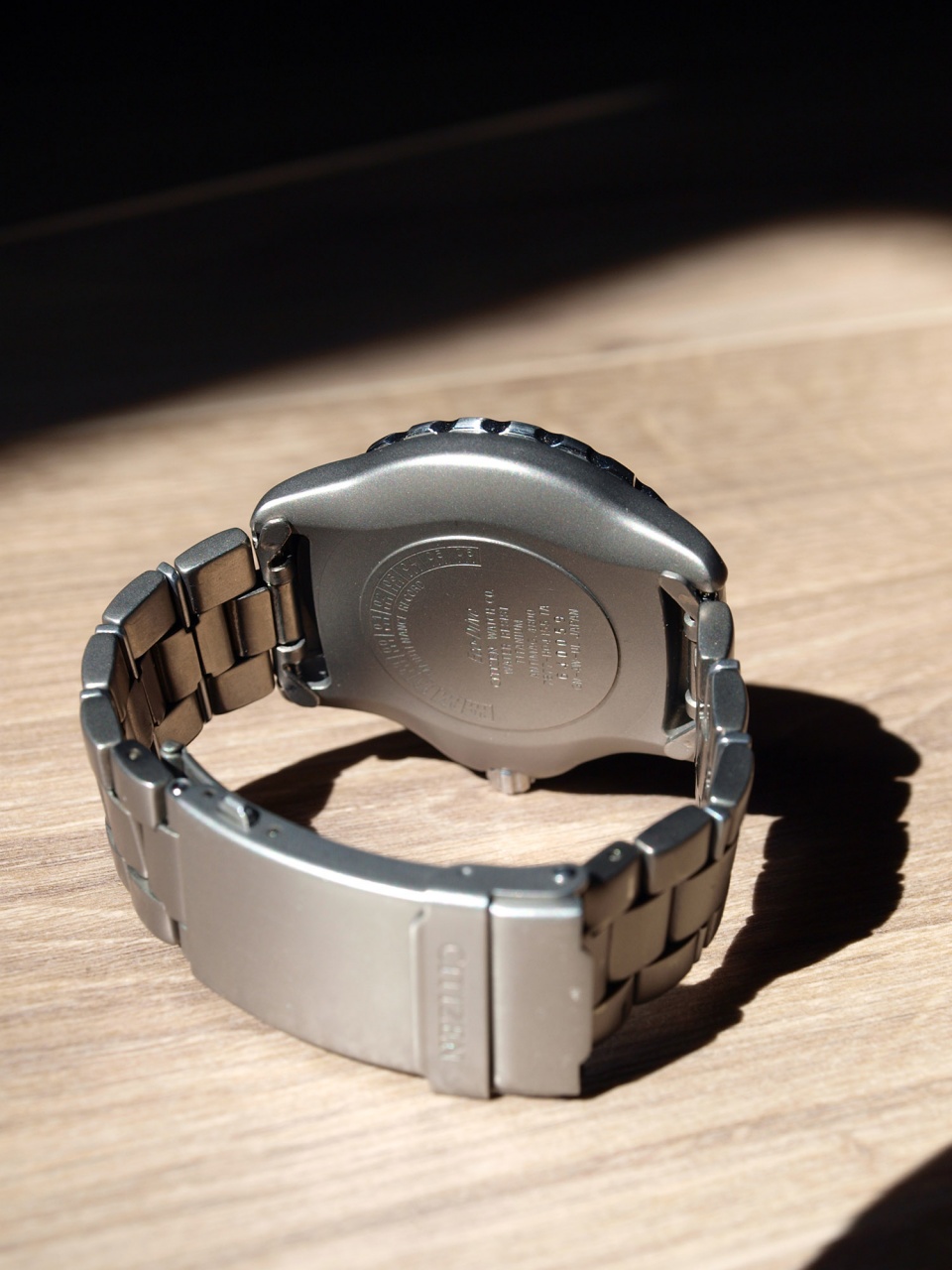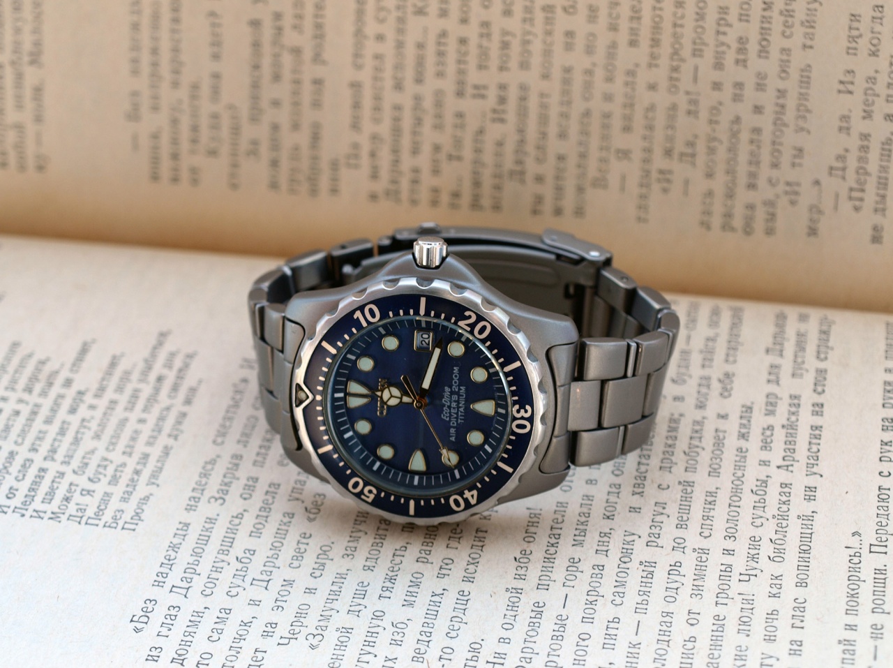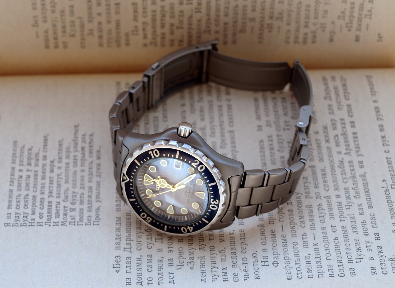 В итоге имеем безумно редкую (в инете практически невозможно найти даже упоминаний о них) модель Citizen Eco-Drive AP0401-59E. Сделаны в Японии в далеком 1996 году. Корпус – титановый монокок. На титановом же браслете. Однонаправленный вращающийся безель на 120 щелчков (да-да, вы не ослышались и я не ошибся, здесь именно 120 плавных приятных щелчков, а не 60 тугих, как на большинстве «гражданских» дайверах). Стекло – выпуклая минералка. Водонепроницаемость 200м. Диаметр 40мм (без учета ЗГ, с ней 43мм), толщина около 9мм. Сколько весят точно не знаю, не взвешивал, но навскидку не тяжелее моих G-shock 5600. На руке под рубашкой не чувствуются совершенно.