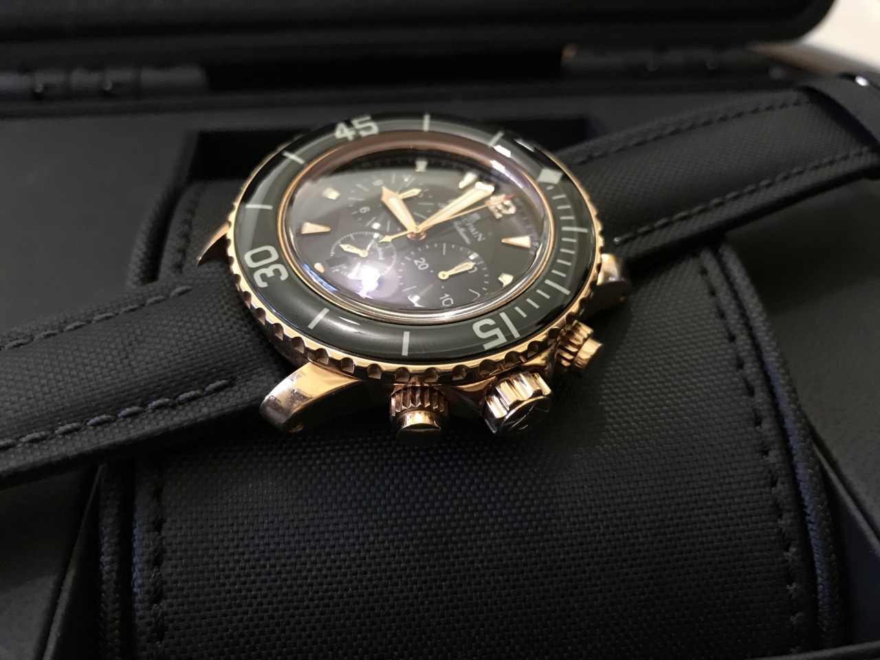 Отличнейший и крупный Diver от Blancpain в прекрасном корпусе из розового золота! Не полировались! Ход отличный! Полный комплект документов! На ремешке следов носки нету!