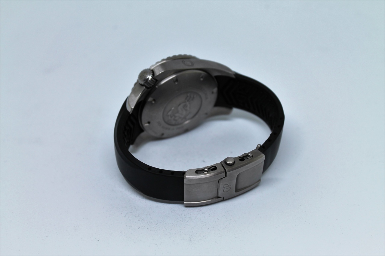 Профессиональные часы для дайвинга, позволяющие погружаться на глубину до 3 000 метров. Снабжены окошечком даты и индикатором запаса хода. Частота 28 800 полуколебаний в час. 26 камней. Корпус титановый с вращающимся рантом, 44 мм. Циферблат черный. Стекло - сапфир. Браслет каучуковый.