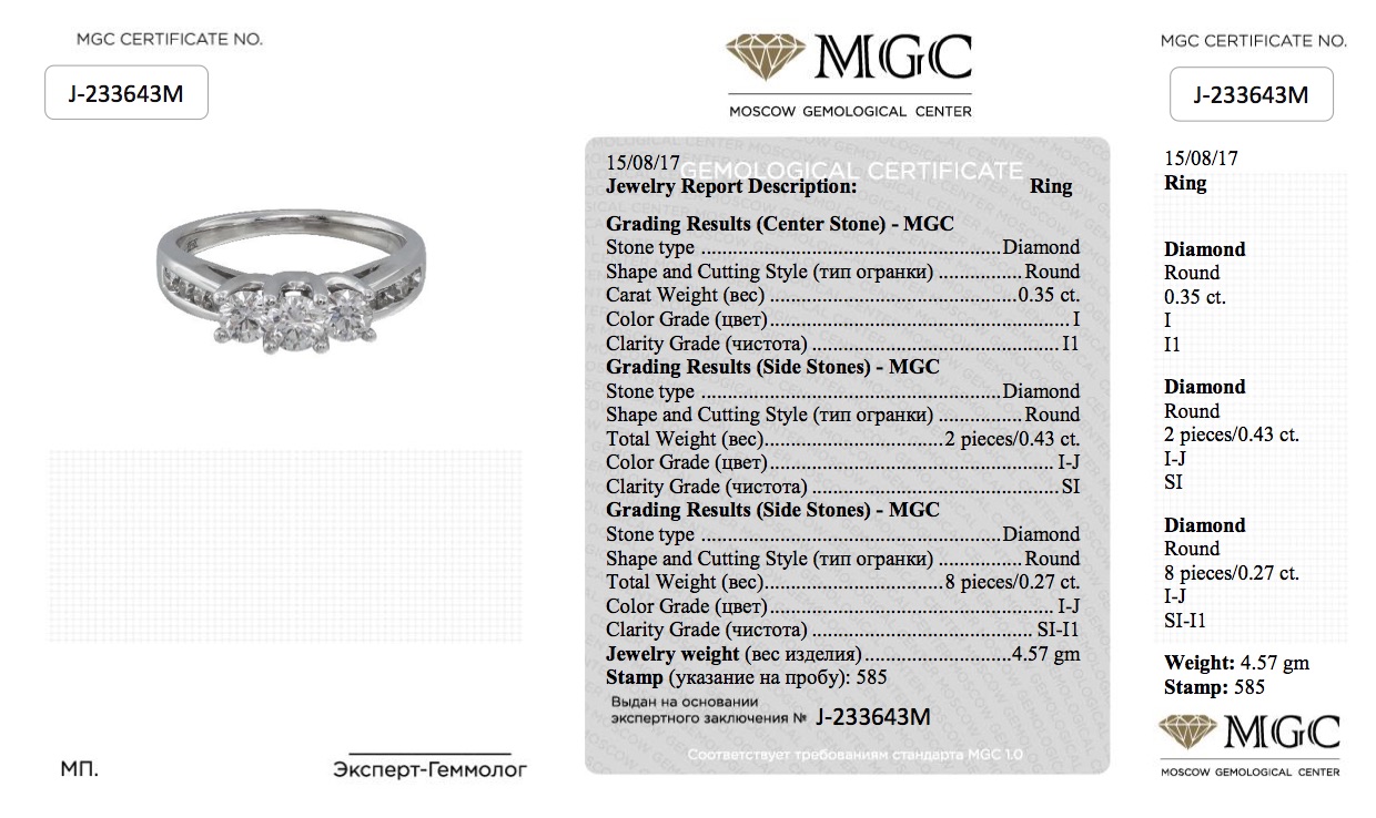 Кольцо из белого золота с бриллиантами 1,05 карат (сертификат МГЦ)