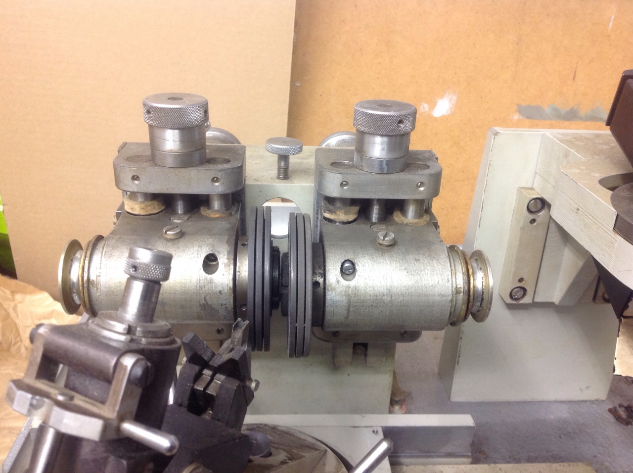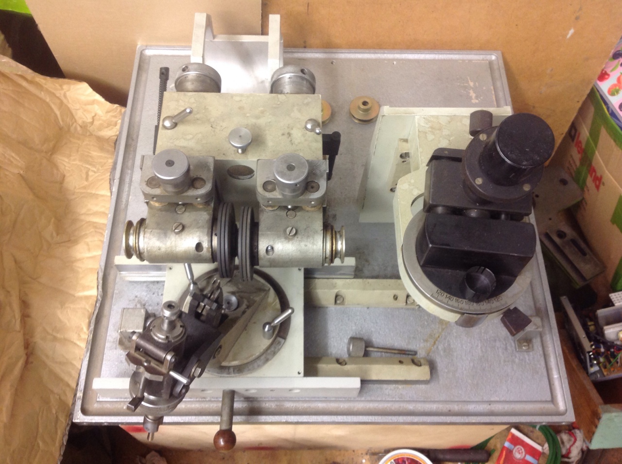 Станок очень легко разбирается на узлы и собирается обратно - все посадки на штифтах. Два шпинделя с алмазными дисками. Микроскоп, для контроля заточки, не снимая сверло со станка. В станке есть куча регулировок: шпинделя двигаются в двух направлениях, Микроскоп и держатель сверл поворачиваются на нужный угол, микроскоп помимо поворота может подниматься-опускаться и ездить вперед-назад.