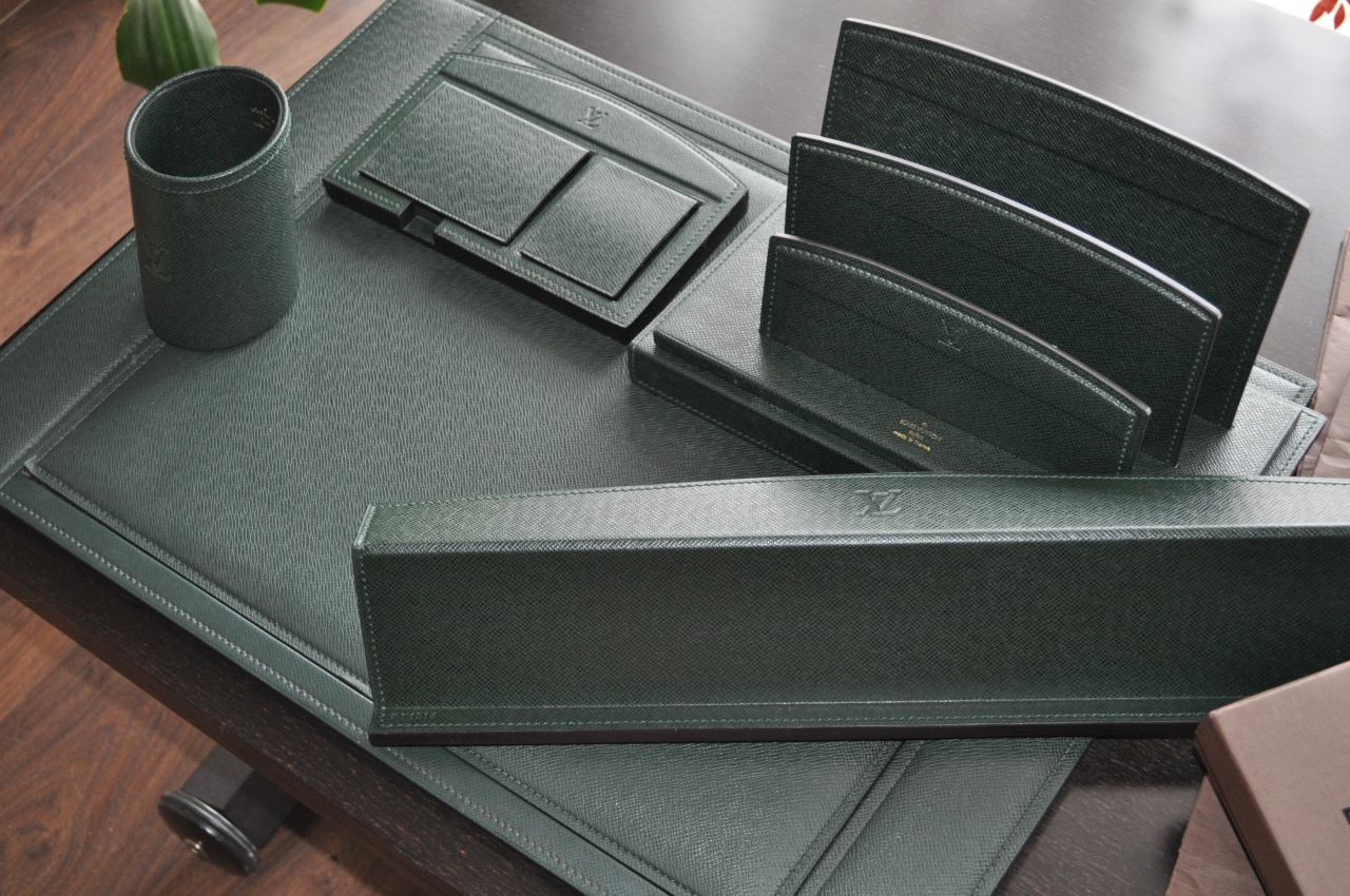 Продаю шикарный письменный набор от LOUIS VUITTON . Отличное состояние , роскошный изумрудный цвет , 5 предметов . Цена продажи : 150.000р .