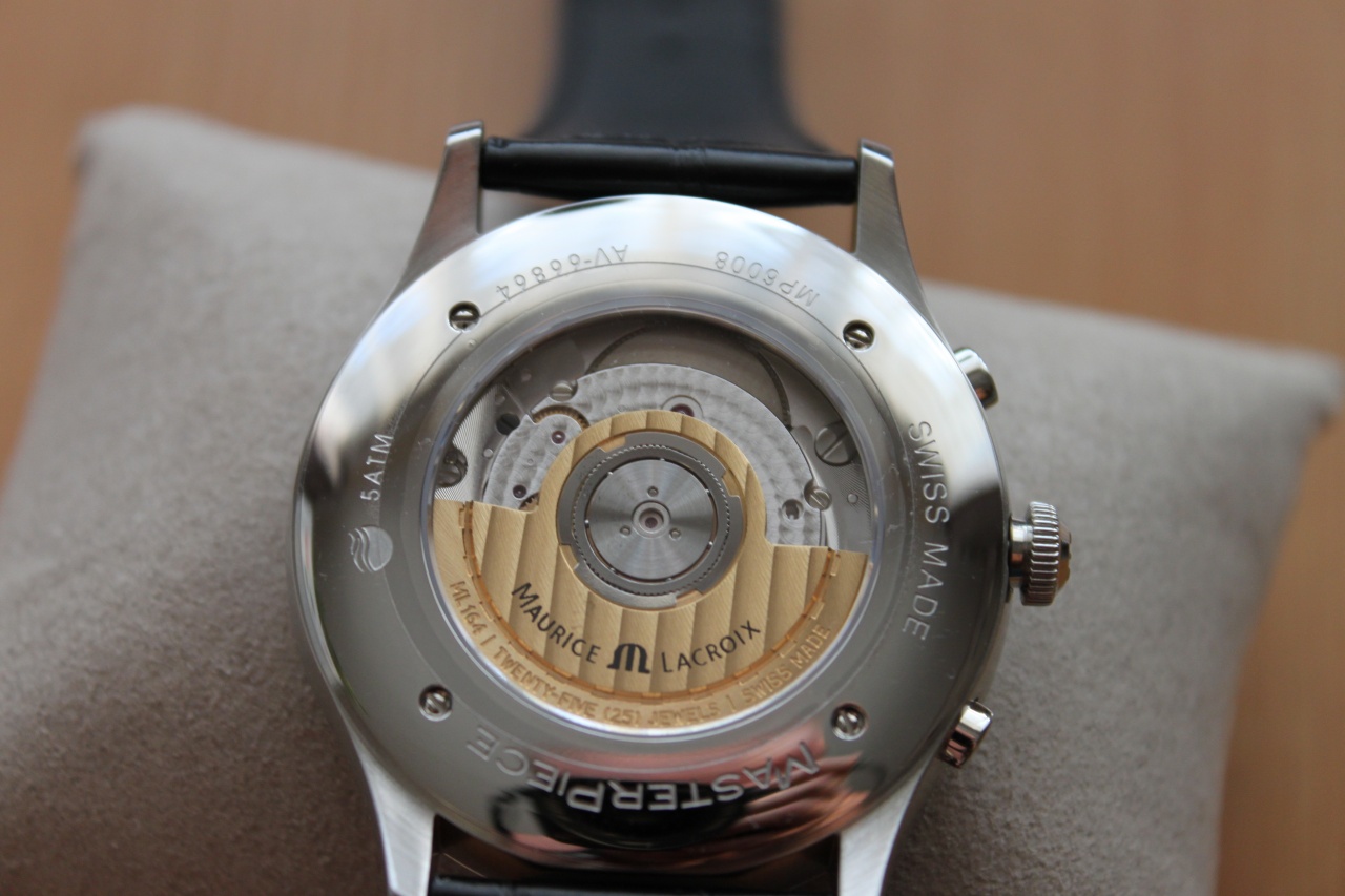 Механизм с автоподзаводом, калибр ML164, , мосты и платина с родиевым покрытием, финишная обработка «жемчужное зернение» и «Cotes de Geneve». Ротор с выполненным вручную круговым зернением, спиралевидным узором и покрытием из 22К золота.