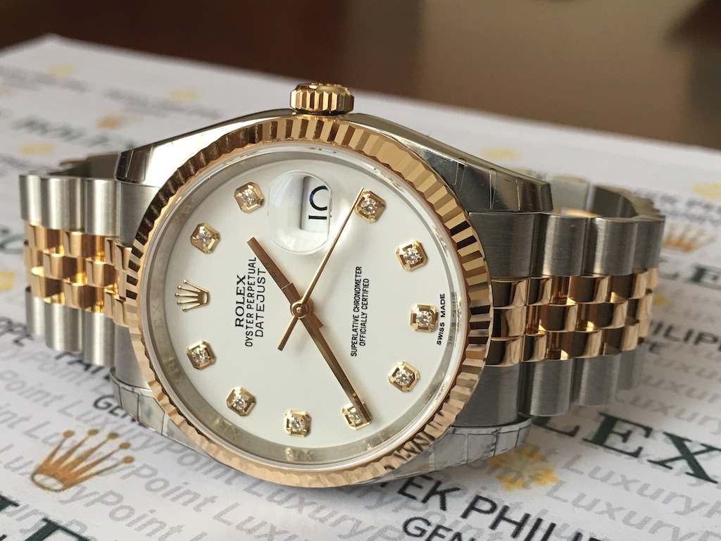 Великолепная возможность порадовать перед наступающими праздниками представительниц прекрасного пола, преподнеся Rolex Datejust из стали и жёлтого золота на удобнейшем браслете Jubilee, являющийся воплощением женственности и хорошего вкуса. Модель диаметром 36 мм с практичным ребристым безелем и красивейшим циферблатом белого цвета с десятью бриллиантовыми часовыми метками.