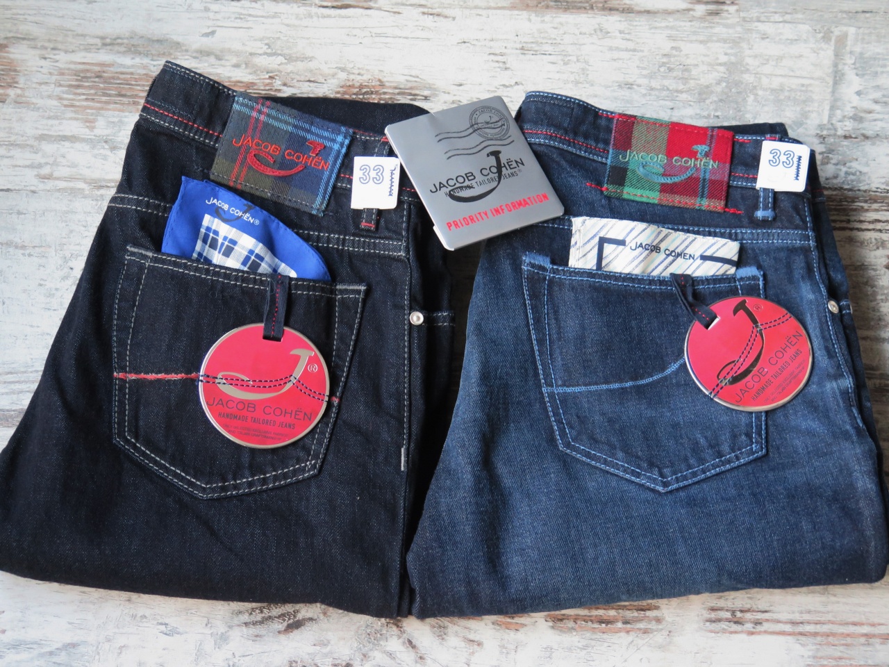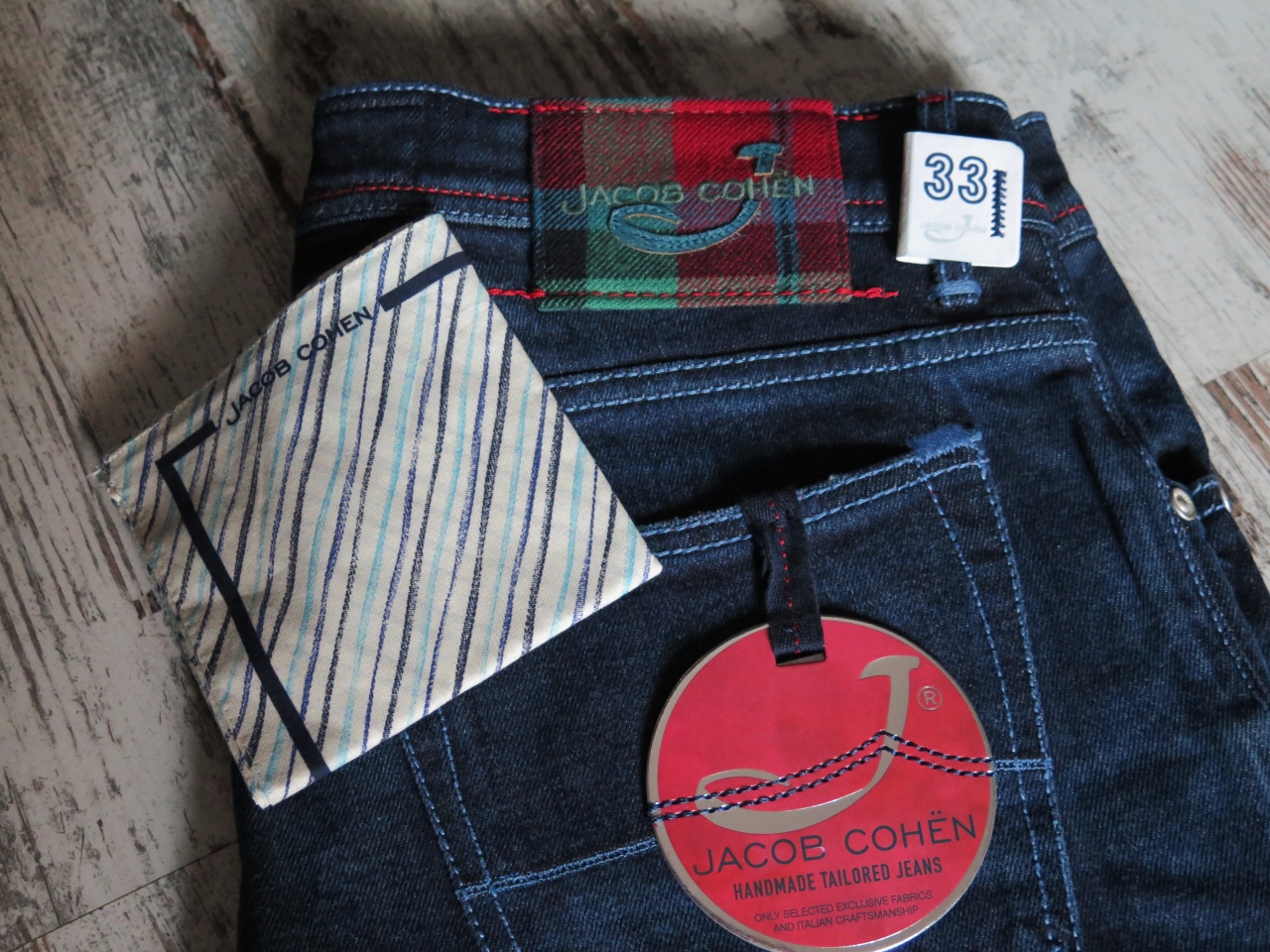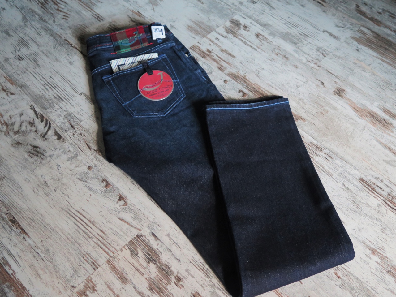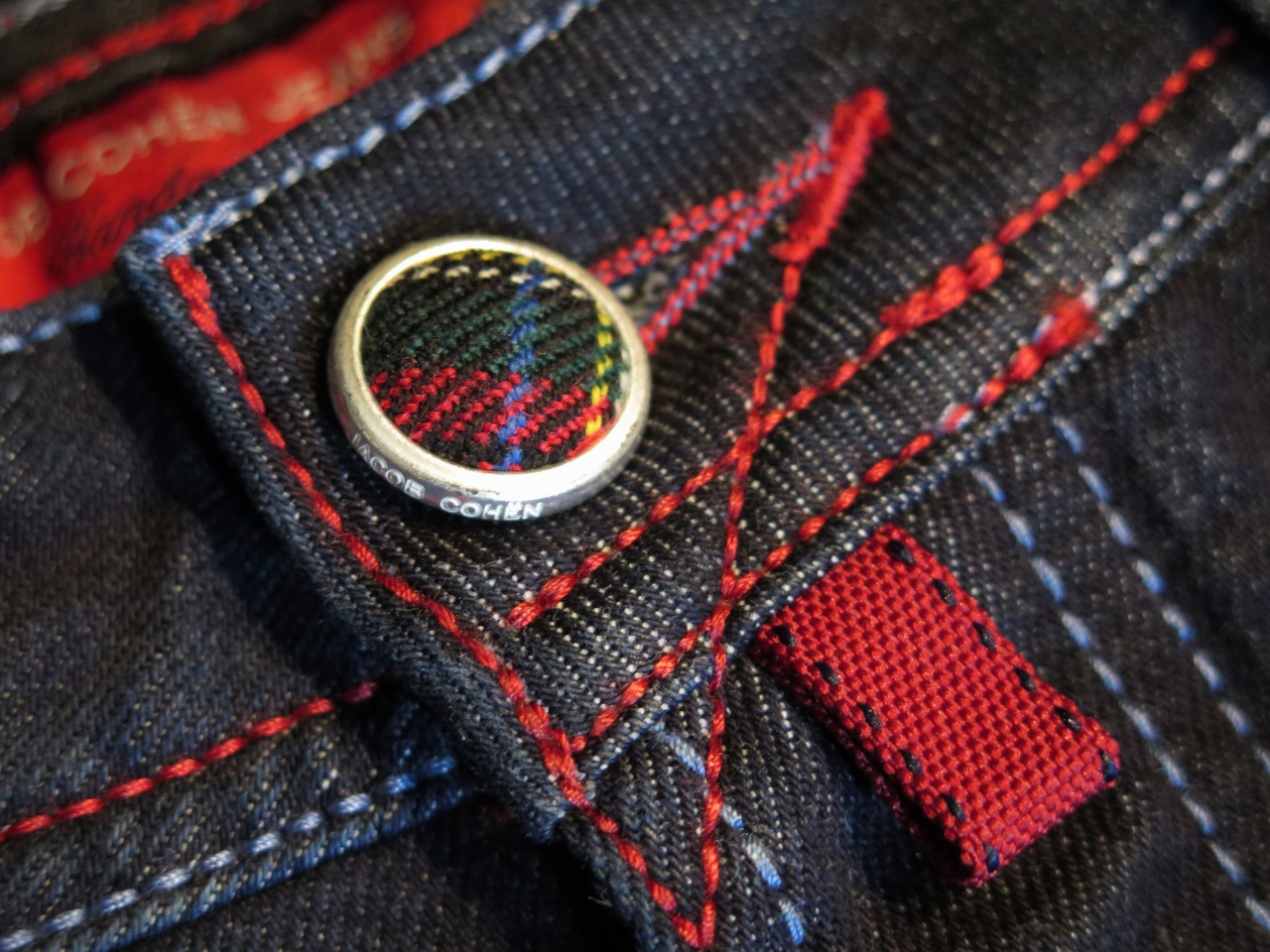Сзади на правом бедре джинсы имеют фирменный ярлык из твида с "шотландским" рисунком с логотипом марки Jасоb Соhёn!!!