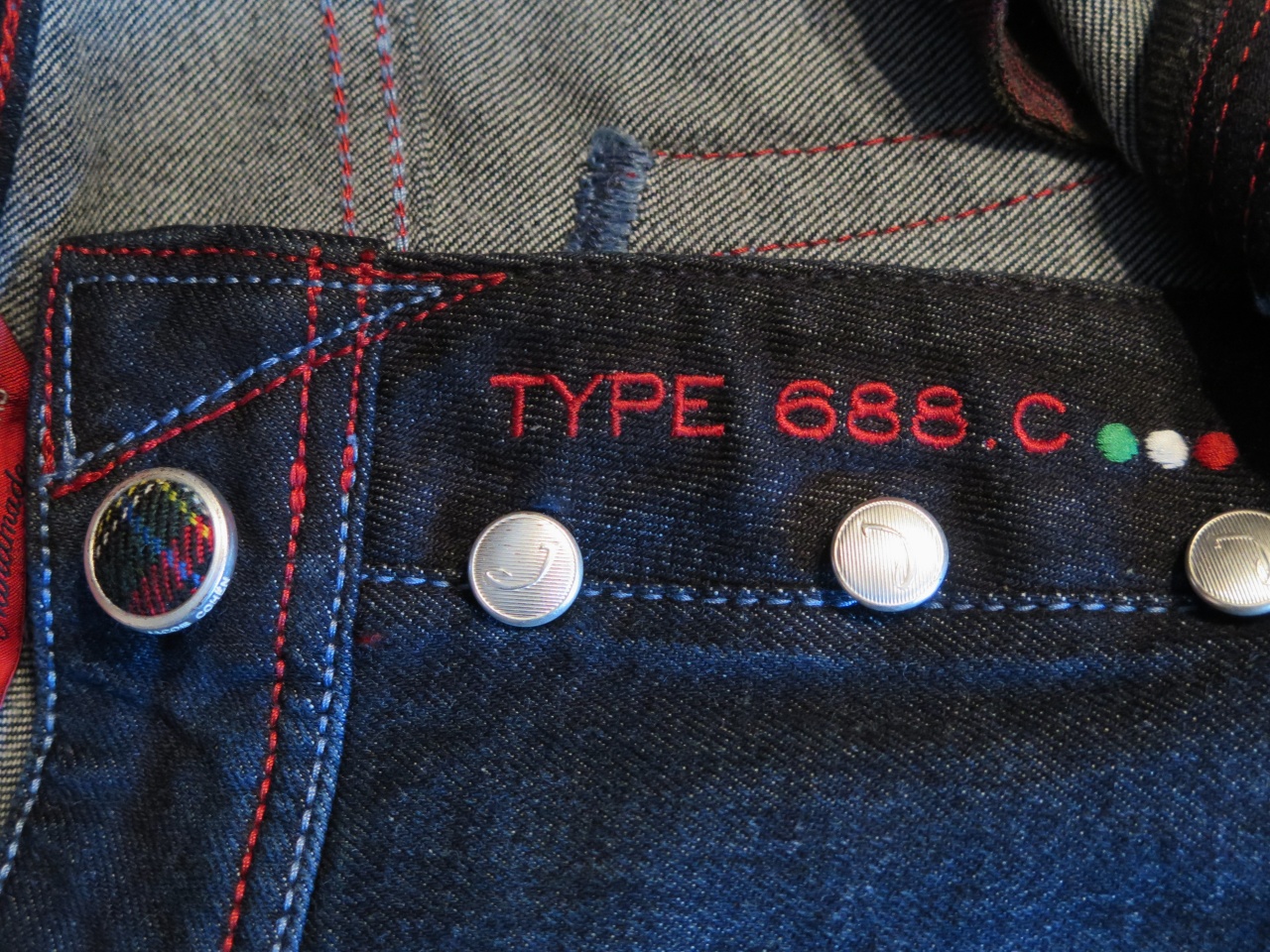 Модель: TYPE 688 С, прямого кроя, застёгивается на фирменные пуговицы, покрытые серебром с логотипом Jасоb Соhёn, основная из которых имеет вставку из твидовой ткани.