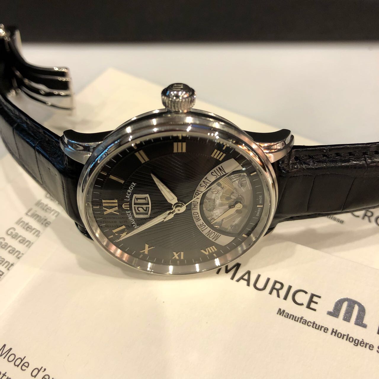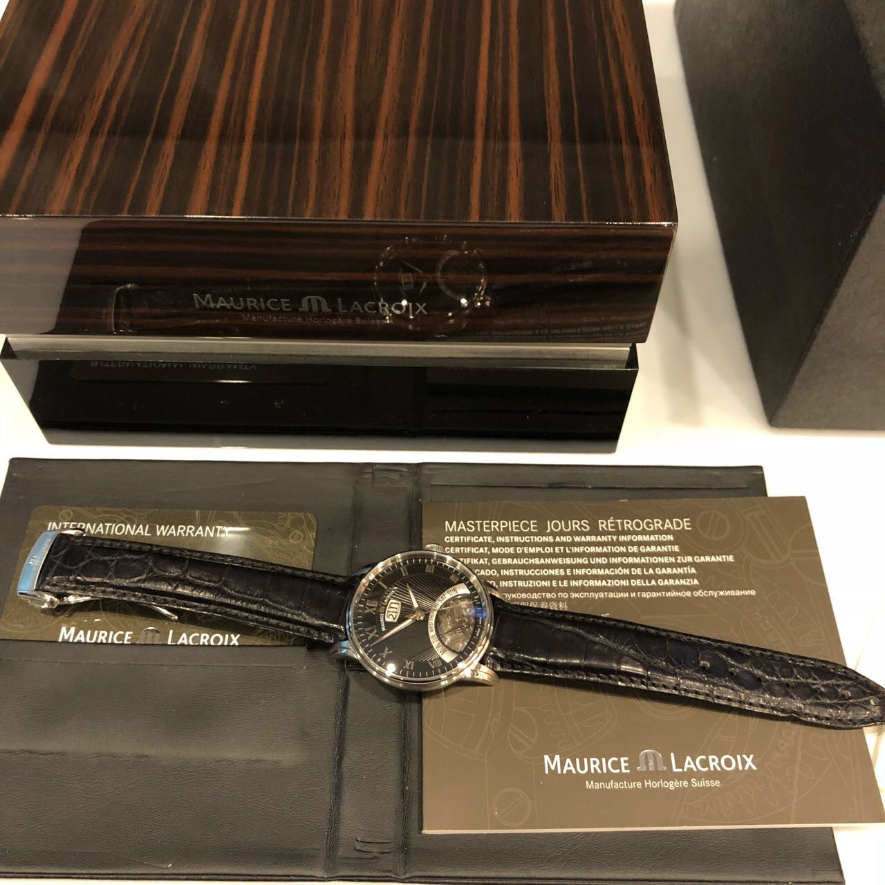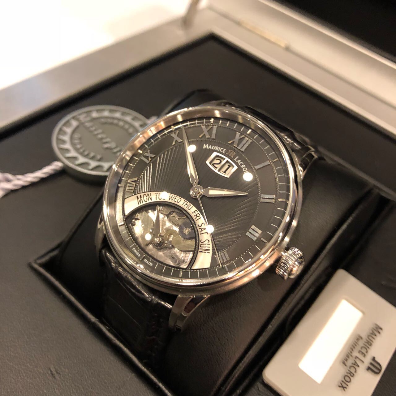 Представляю вам часы Maurice Lacroix Jours Retrogrades MP6358-SS001-31E от швейцарской мануфактуры Maurice Lacroix. Корпус часов диаметром 40 мм выполнен из стали. Тип механизма в часах - механика с автоподзаводом. Часы помимо стандартного набора функций (Часы, минуты, секунды) оснащены такими полезными функциями как большая дата и ретроградный индикатор дня недели. Часы Maurice Lacroix Jours Retrogrades дополнены новым чёрным ремешком из кожи аллигатора, который прекрасно сочетается с чёрным, частично скелетонищированным циферблатом.