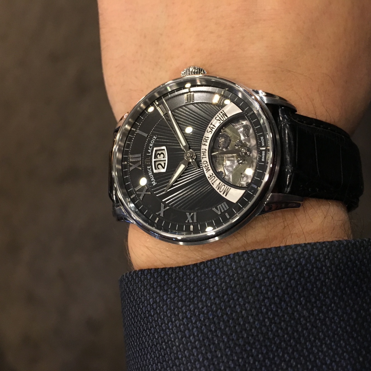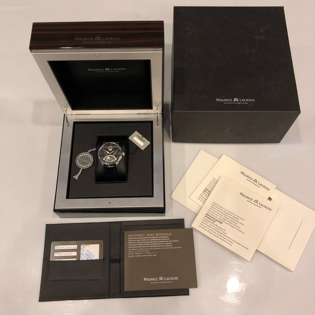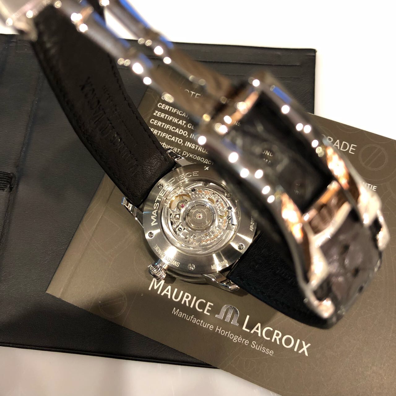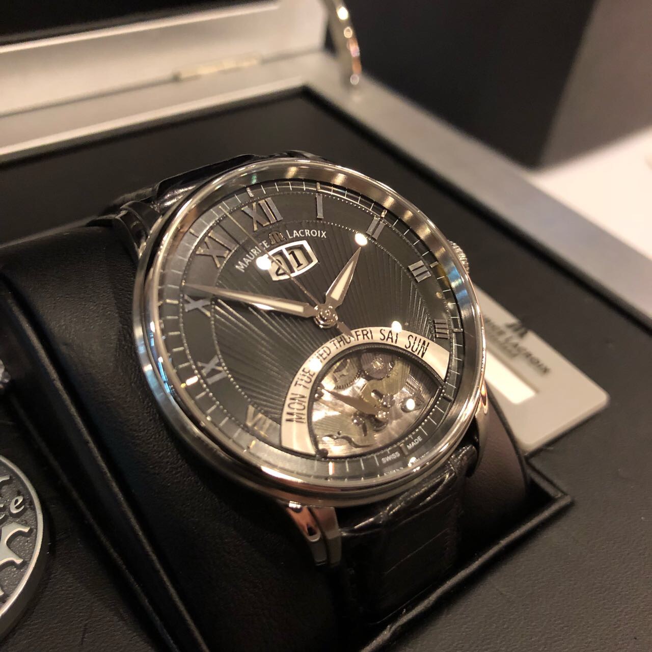 Представляю вам часы Maurice Lacroix Jours Retrogrades MP6358-SS001-31E от швейцарской мануфактуры Maurice Lacroix. Корпус часов диаметром 40 мм выполнен из стали. Тип механизма в часах - механика с автоподзаводом. Часы помимо стандартного набора функций (Часы, минуты, секунды) оснащены такими полезными функциями как большая дата и ретроградный индикатор дня недели. Часы Maurice Lacroix Jours Retrogrades дополнены новым чёрным ремешком из кожи аллигатора, который прекрасно сочетается с чёрным, частично скелетонищированным циферблатом.