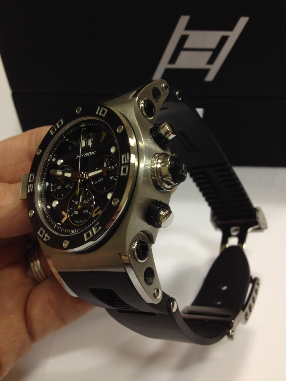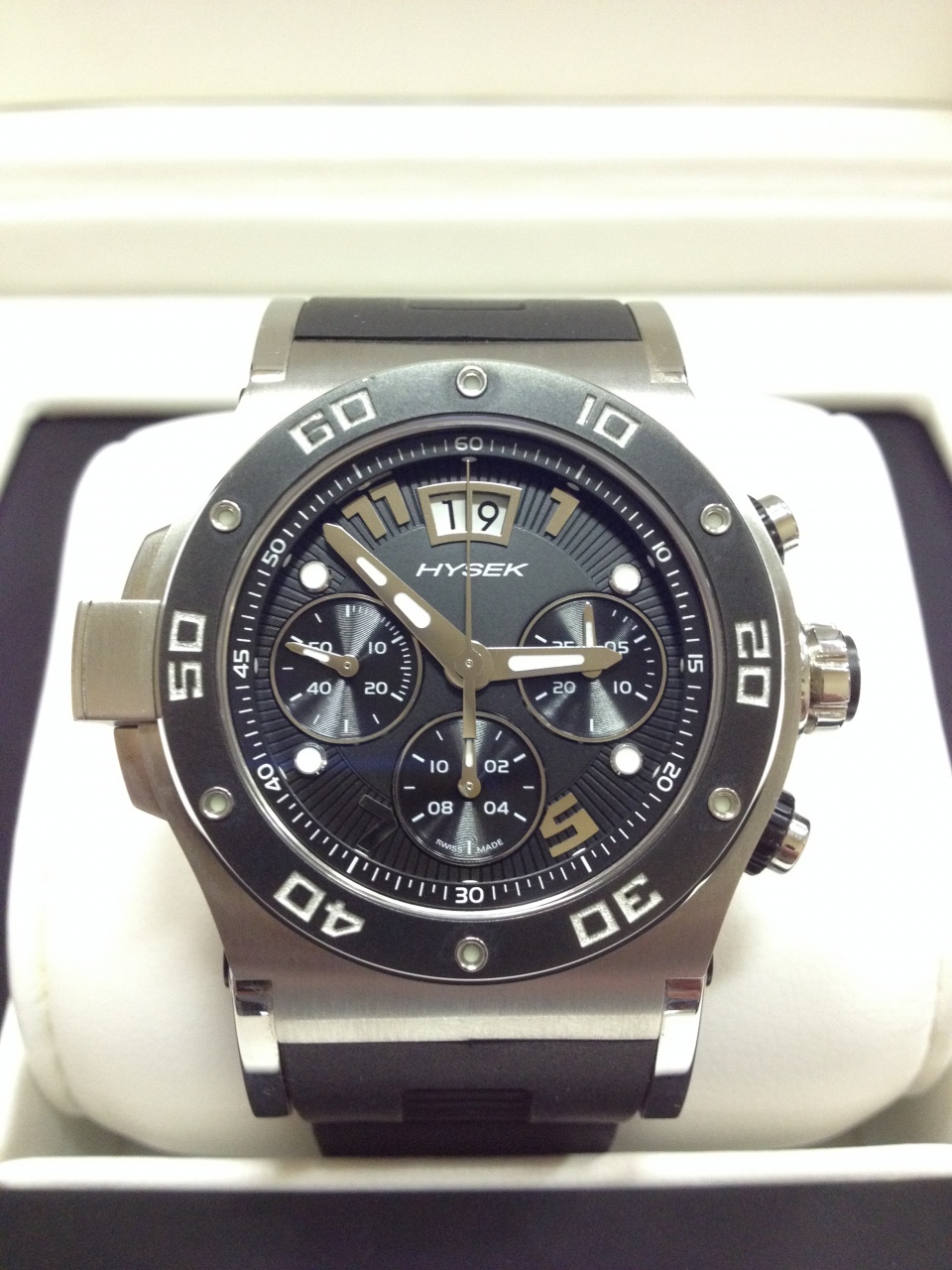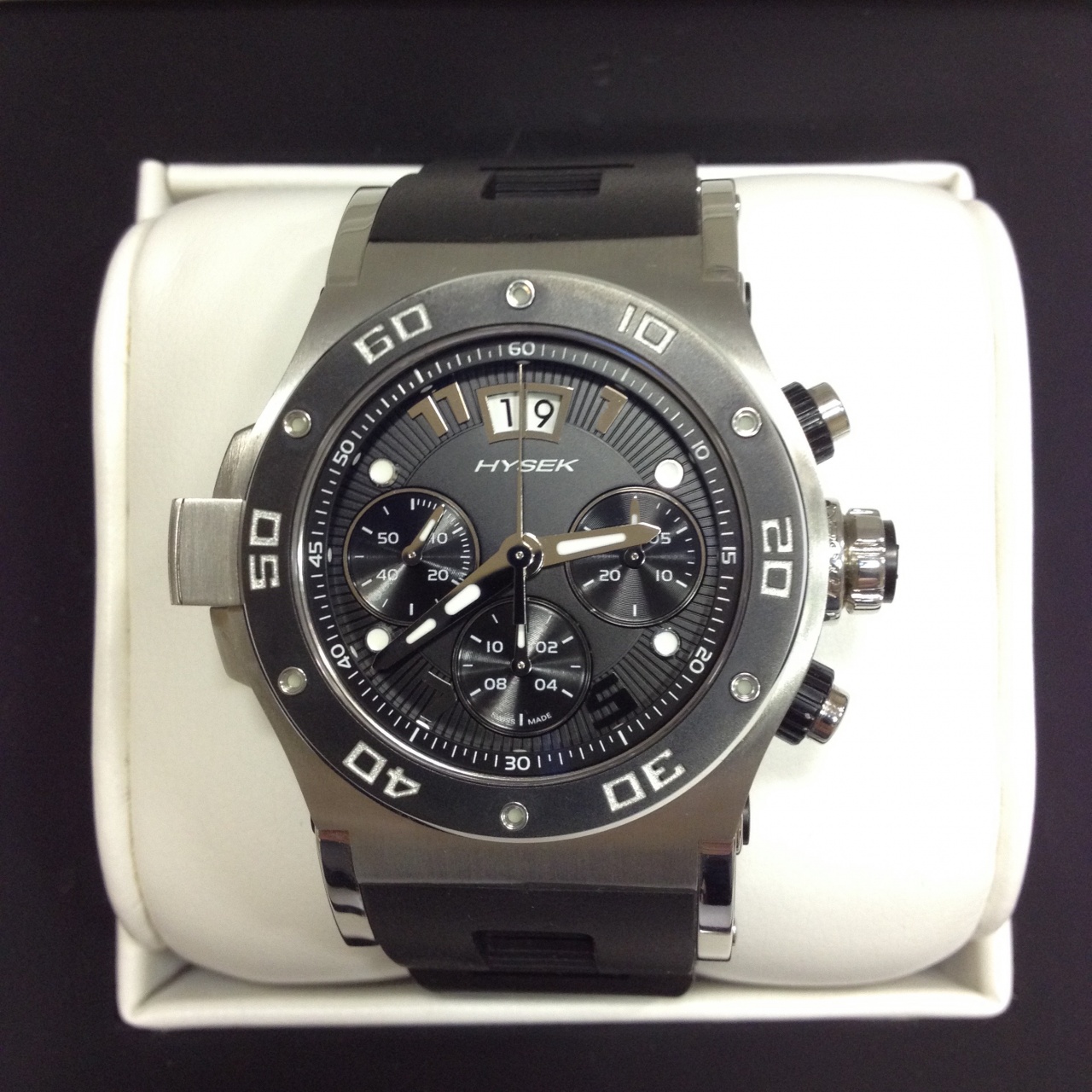 Настоящий мужской хронограф с большой датой. Автоматический механизм. Стальной корпус диаметром 44 мм. Водонепроницаемость 300 м. Закручивающиеся головка и кнопки хронографа. Уникальная система фиксации вращающегося безеля. Антибликовое сапфировое стекло. Каучуковый ремешок с браслетной застёжкой.