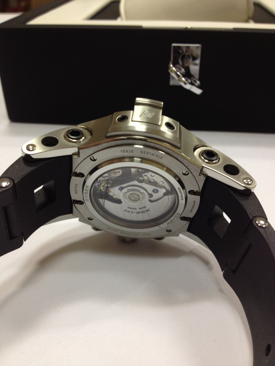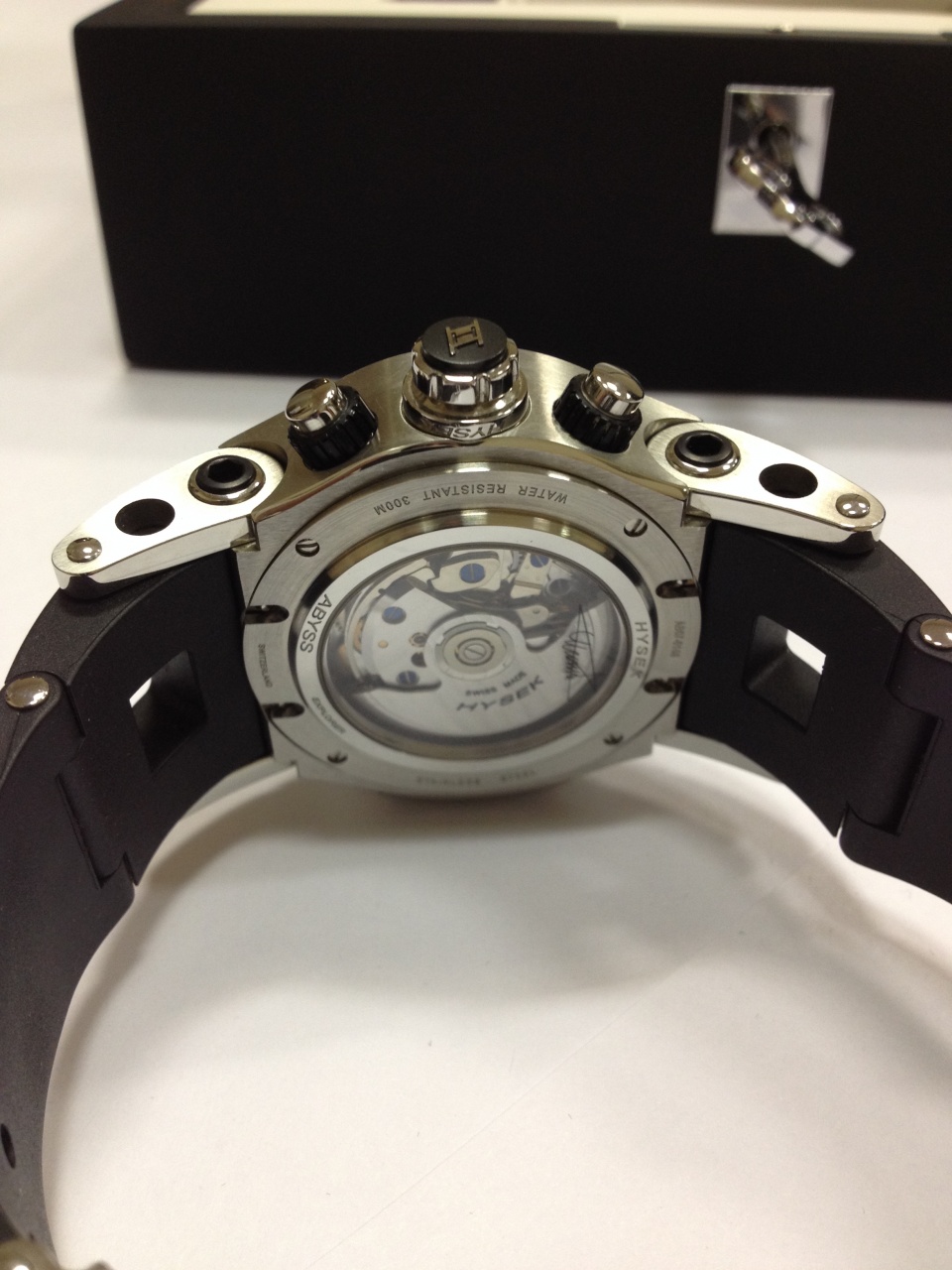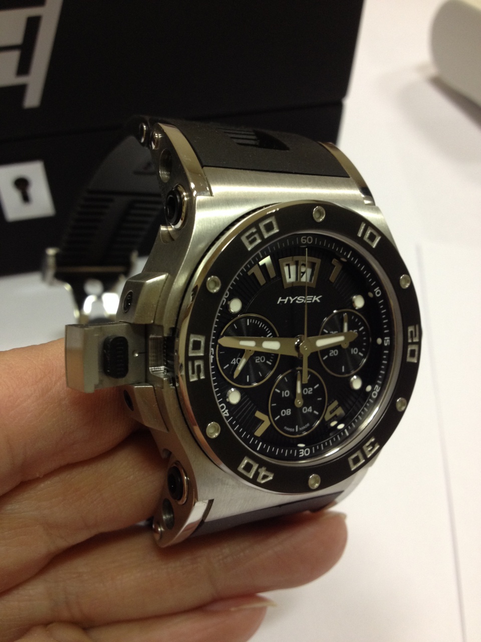 Настоящий мужской хронограф с большой датой. Автоматический механизм. Стальной корпус диаметром 44 мм. Водонепроницаемость 300 м. Закручивающиеся головка и кнопки хронографа. Уникальная система фиксации вращающегося безеля. Антибликовое сапфировое стекло. Каучуковый ремешок с браслетной застёжкой.