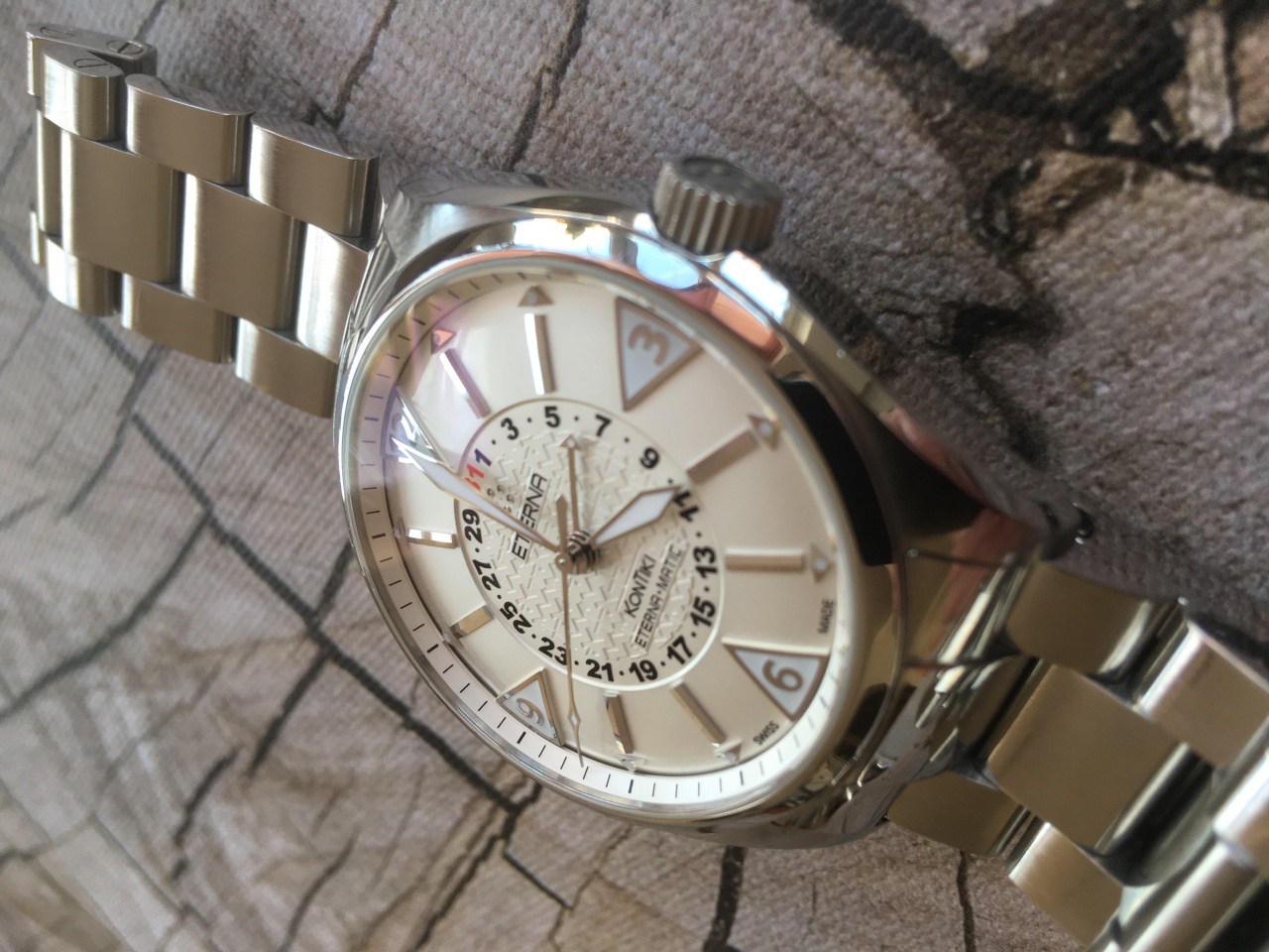 Замечательные швейцарские часы Eterna KonTiki - 1592.41.11.0217 на мой взгляд одна из самых интересных моделей бренда! В отличном техническом состоянии. На корпусе есть незначительные следы эксплуатации, ничего критичного, в глаза не бросается. Браслет в идеале, доп.звенья в наличии. Как говорится одел и пошел, не требуют никаких вложений. По качеству исполнения с уверенностью могу сказать что на одном уровне с Omega! Циферблат загляденье, просто залипаешь!)