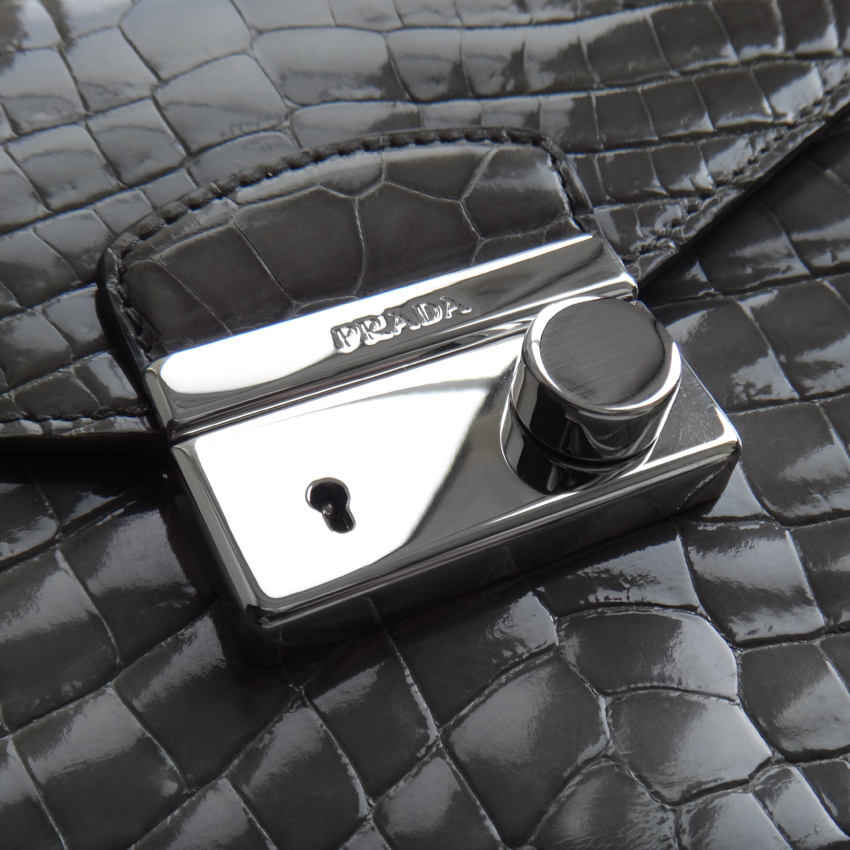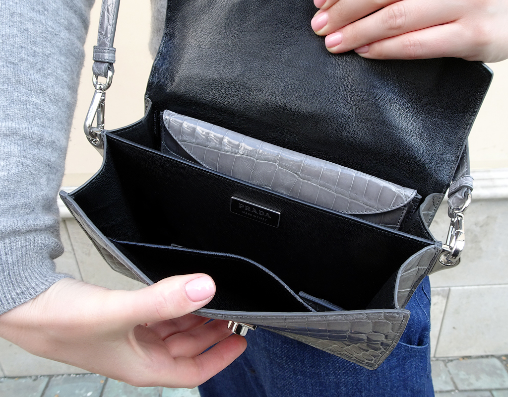 Сумка закрывается на фирменный пуш-лок замок Prada, и на ключик (два ключа в комплекте). Для ключей предусмотрен чехольчик-колокольчик, естественно также из кожи крокодила.