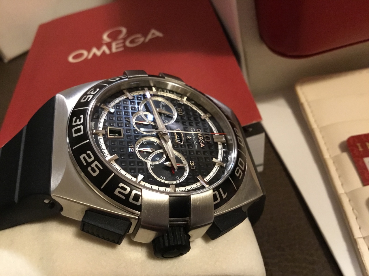 Движение хронографа с автоподзаводом с коаксиальным спуском и свободным балансом. Индикатор даты, дня, час, минута и непрерывная секундная стрелка. Ручка центрального хронографа, 30-минутный счетчик, 12-часовый тотализатор и 7-дневный сумматор. Изменение даты в полночь с мгновенным прыжком. Роскошная отделка с волнами Женевы. Официально сертифицированный хронометр.