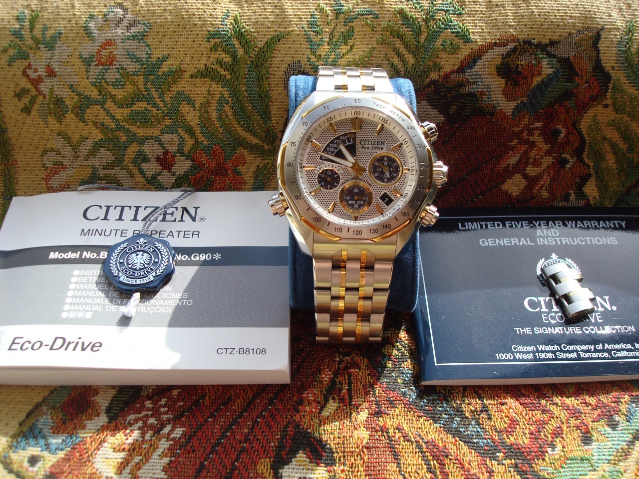 В данное время очень редкая модель даже на американском рынке. Минутный репитер ,биколор в стальной версии. Калибр G 910. Думаю модели на данном калибре особо представлять не надо: Citizen Signature- Grand Complication. Ставлю состояние АА,так как мое мнение часы соответствуют этому состоянию,готов выслушать ваши мнения. Коробки нет ! Все что прилагается к данным часам отражено на фото. Снимки сделаны в " макро " режиме,так что на самом деле царапины не так заметны. На безеле между 55 и 60 есть небольшая царапина,на застежке браслета небольшие царапины,звенья браслета на винтах. Стекло- сапфир,чистый без царапин. Цену ставлю 35000 рублей с моей доставкой "из рук в руки " курьерской службой. 100% оплата на карту Сбербанка.