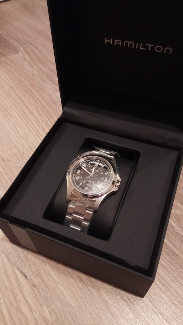 Продам часы Hamilton Khaki King II H64455133. На родном браслете (!) Известны также как "часы доктора Хауса" по одноименному сериалу. Часы новые, в пленках, со всеми бумажками и коробкой. Пришли на днях. Причина продажи - не зацепили. Хотя сам искал долго именно эту модель, но увы, когда оказались в руках - не сели на руку, как говорится.