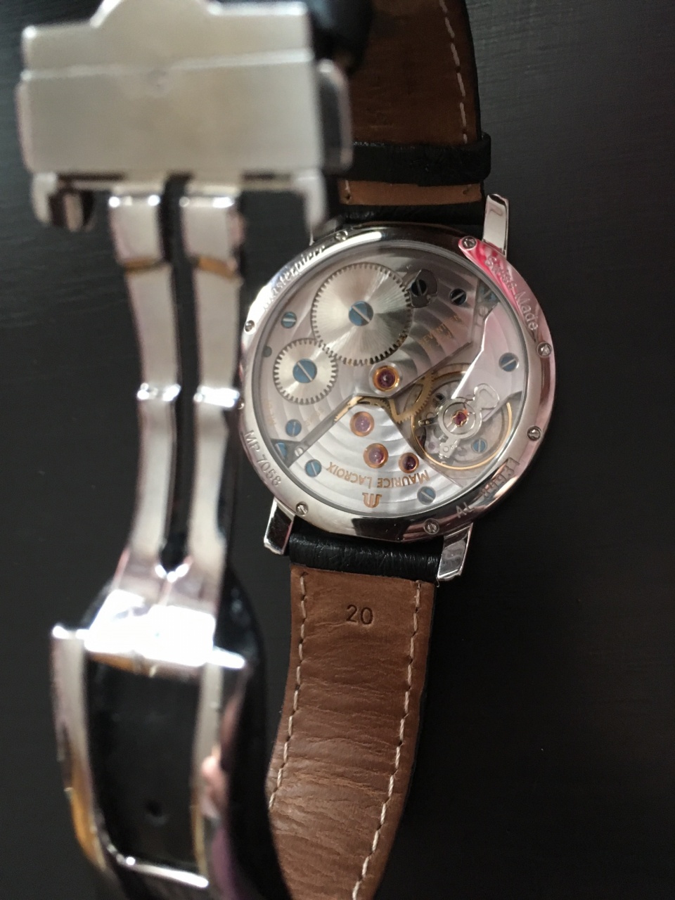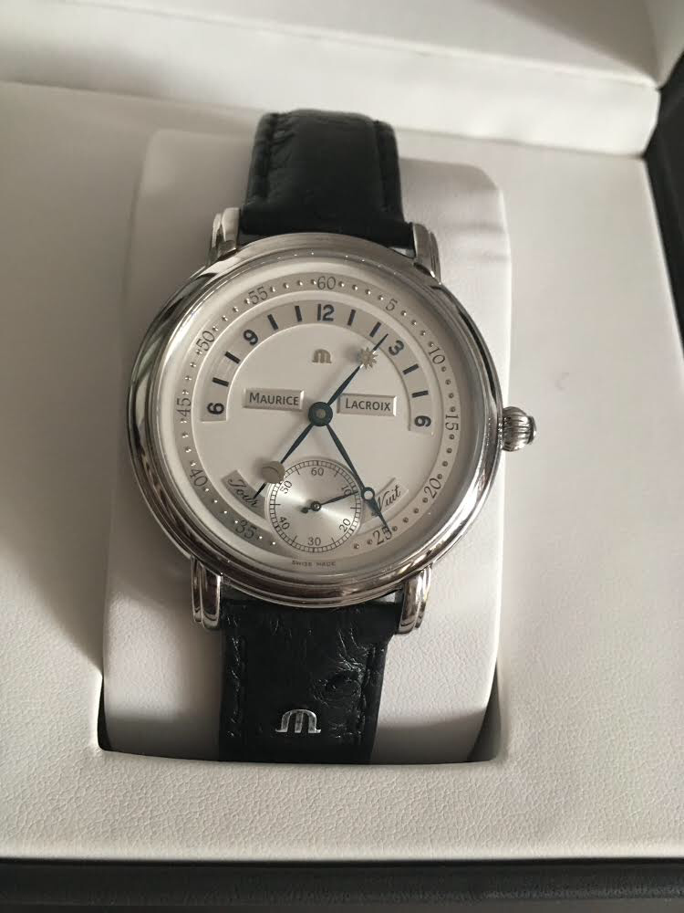 В отличном состоянии, покупались новыми у уважаемого форумчанина. Циферблат: 24-часовой, цельное серебро; сатинированная полуокружность с накладными арабскими цифрами и часовыми метками из вороненой стали; минутная шкала с 5-минутной числовой прогрессией нанесена способом шелкотрафаретной печати; стрелки из голубой стали: часовая с двумя противоположными наконечниками (в виде Солнца для дневного времени (от 6 до 18 часов); в виде Луны для ночного времени (от 18 до 6 часов), минутная - в стиле Breguet.