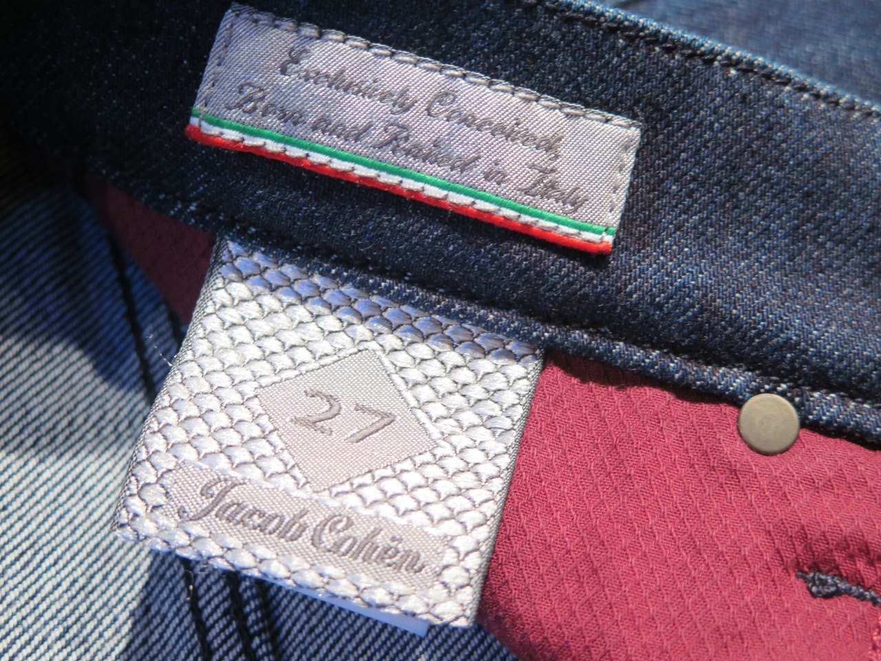 Сзади на правом бедре джинсы имеют фирменный ярлык из кожи пони с логотипом марки Jасоb Соhёn, выполненный из металла, что указывает на принадлежность к "лимитированной" линейке марки .