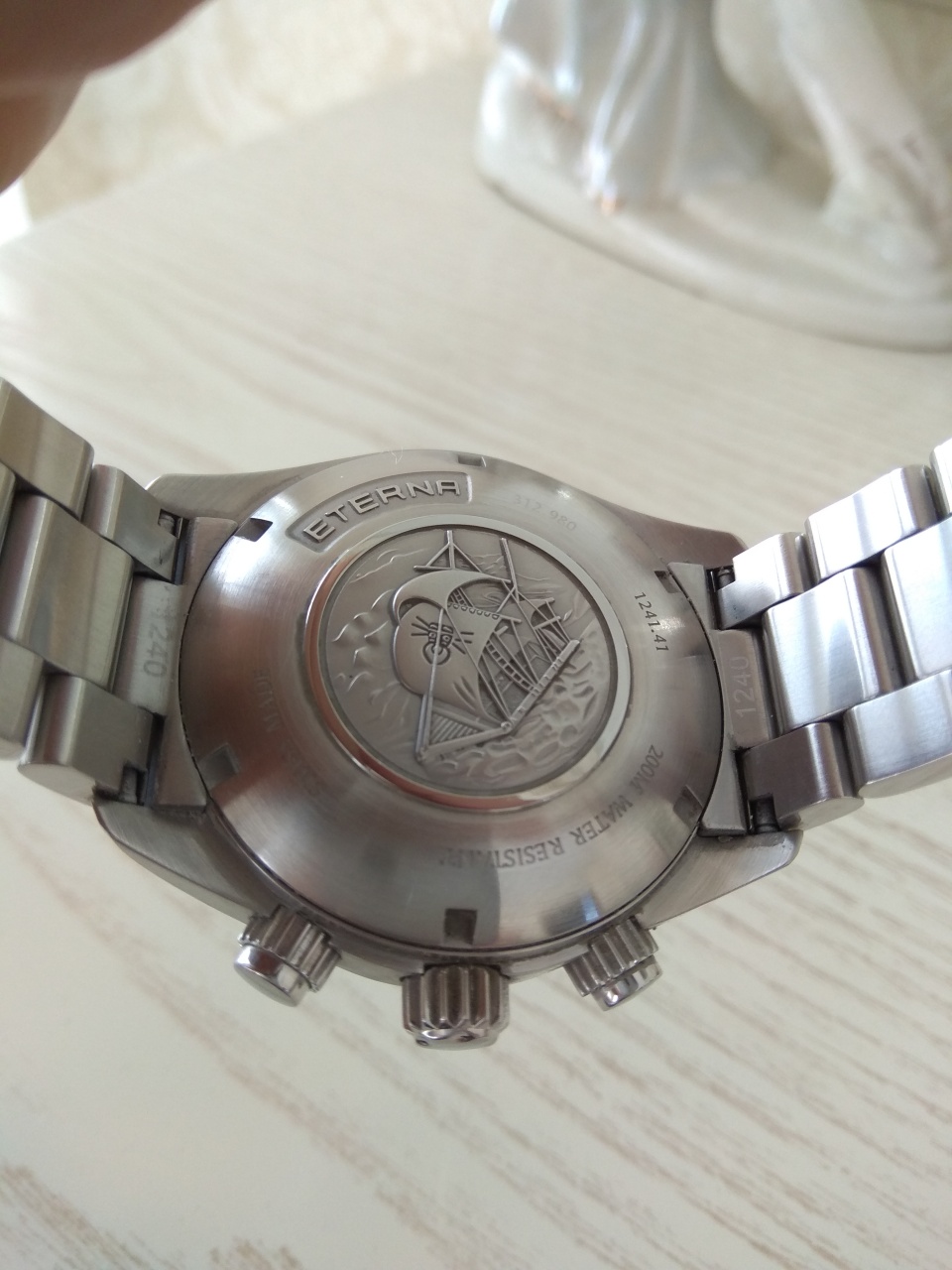 Купольное сапфировое стекло с антибликом. Кроме того, эта модель Eterna обладает водонепроницаемостью до 20 бар (200 метров).