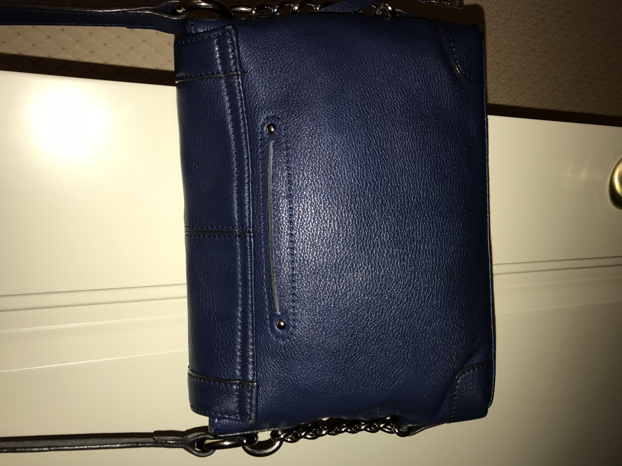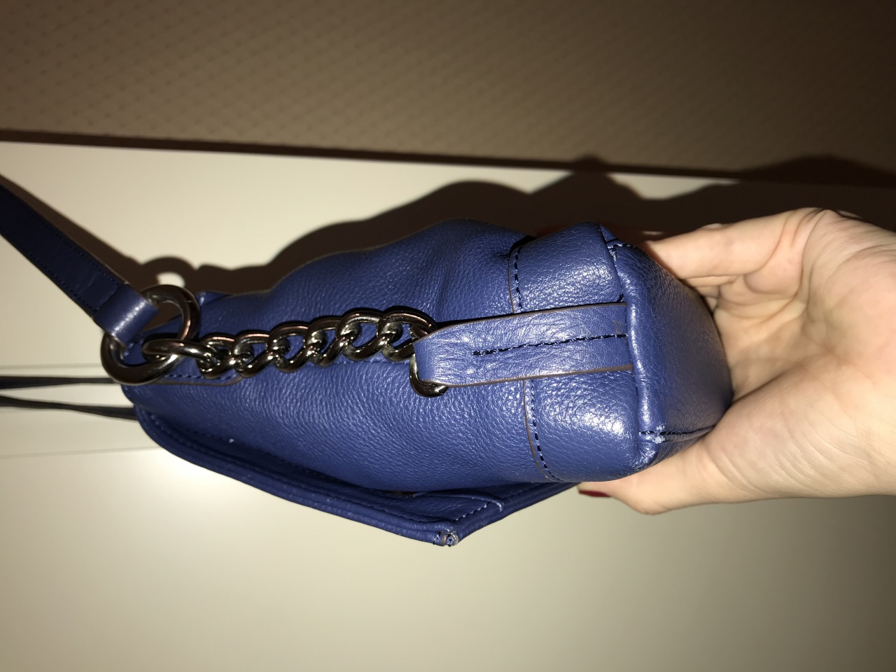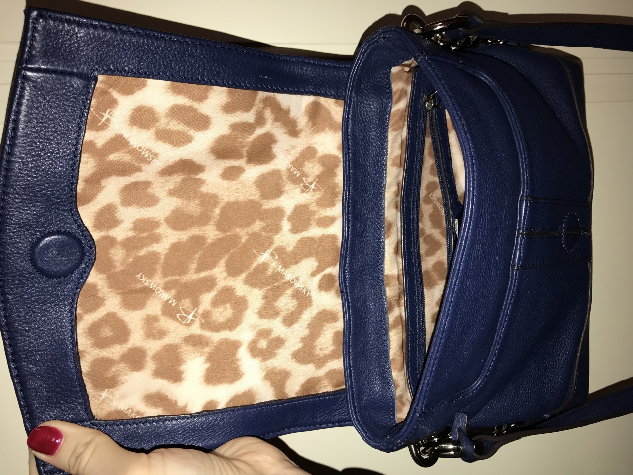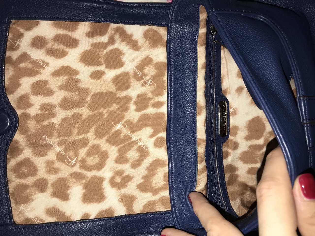 Сумка женская кросс-боди темно-синего цвета американской фирмы B.Makowsky. Была привезена в 2015 году из Америки, данная фирма не представлена в России. Полный комплект: сумка, пыльник, бирки. Цена указана на бирке. Натуральная мягкая кожа, очень качественное исполнение сумки. Сумка не единственная в гардеробе, носила только летом, есть потертости на дне в уголках сумки (сделала фото), в остальном ручка, подклад, внешнее состояние достойные. Но из-за небольших потертостей отдаю практически даром от стоимости покупки-всего 3000 руб. Параметры:25*20*8, ручка длинная в районе 130 см., регулируется.