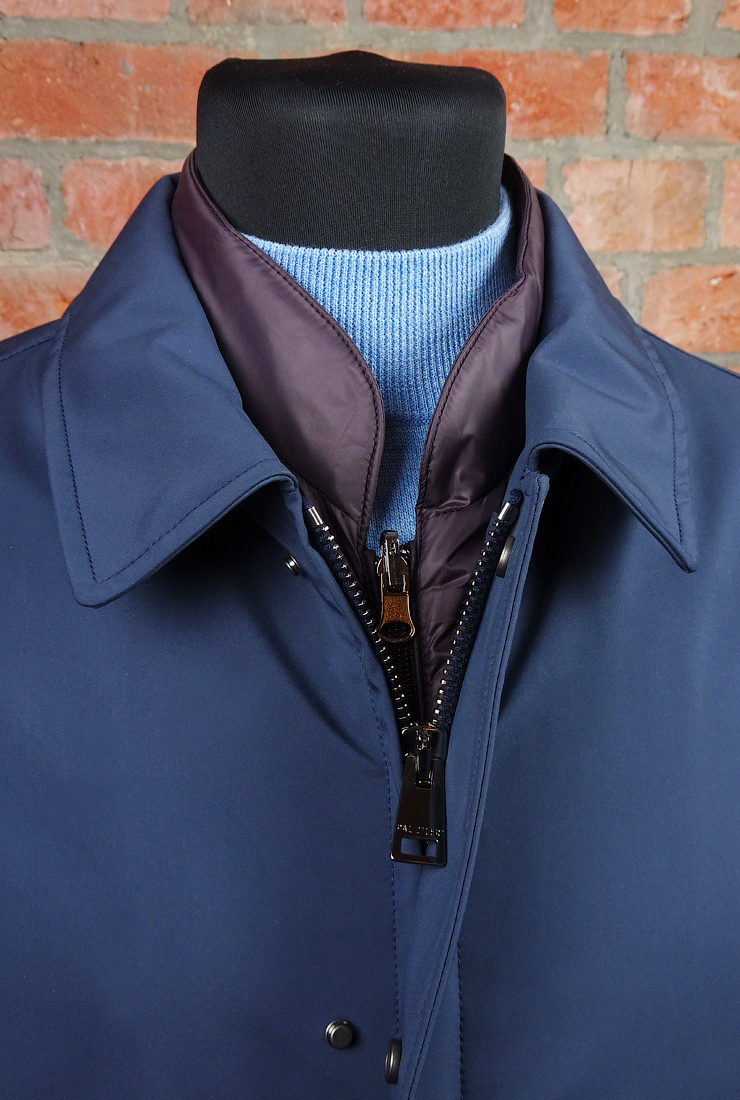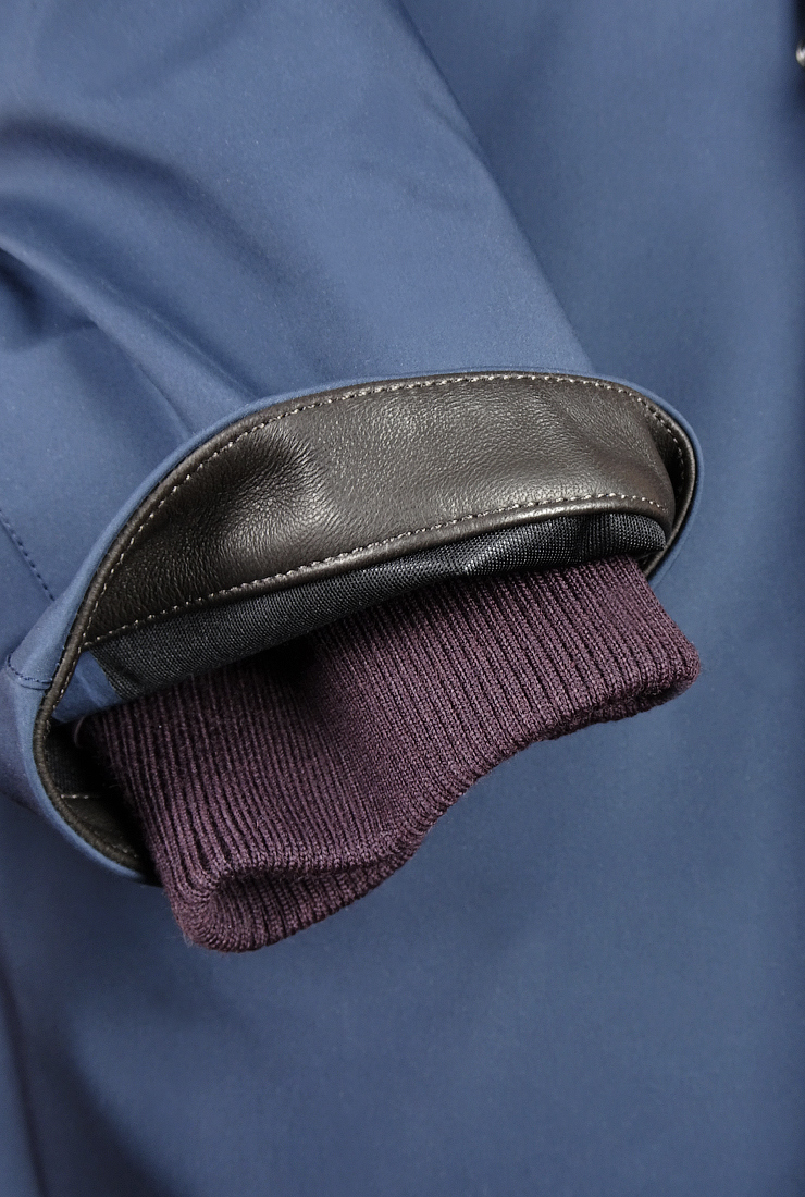При этом внешне смотрится очень элегантно, фасон в стиле Kiton. Воротник поднимается, с внешней стороны оторочен кожей и прострочен зигзагом.