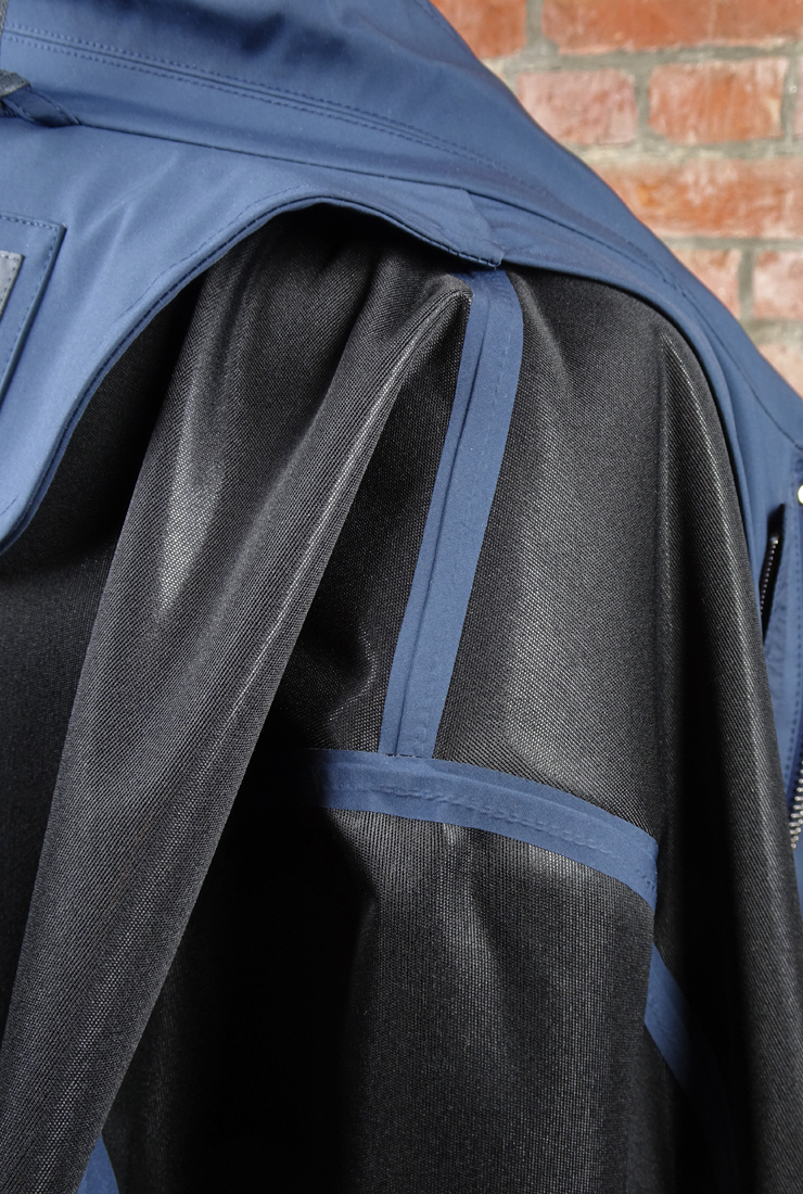 Верхняя часть - плащ стильного темно-синего цвета из плотного непромокаемого материала, с отличной защитой от влаги и ветра. С изнанки плаща все швы проклеены, как на профессиональном снаряжении.