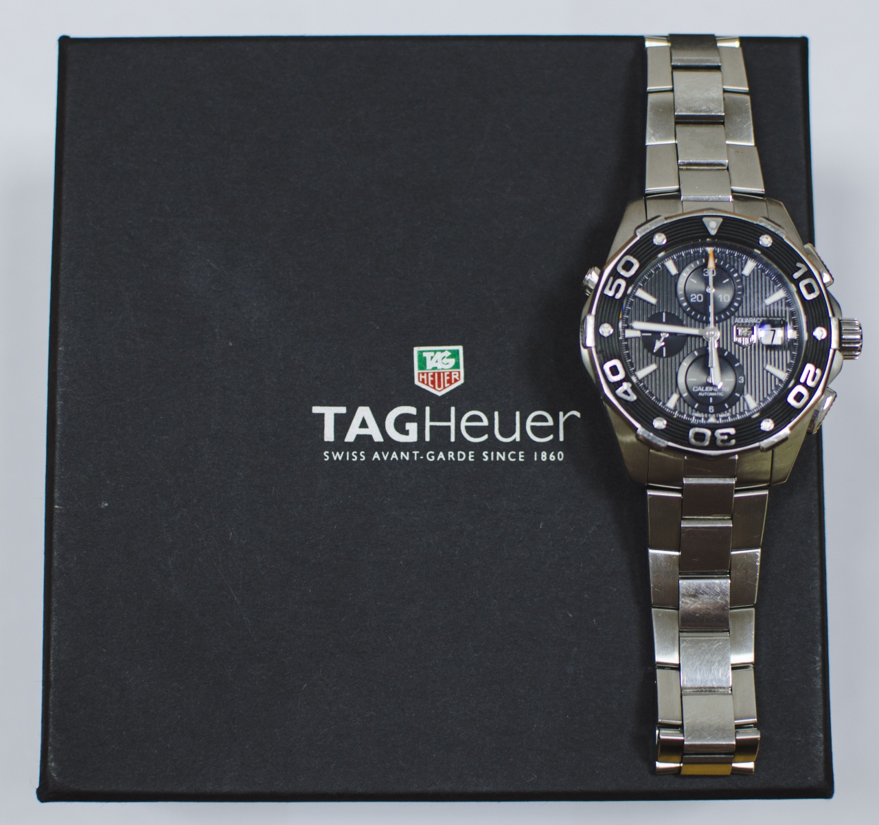 Tag Heuer Aquaracer Automatic Chronograph 500 M, Calibre 16 CAJ2110. Место покупки Италия, Сиена. Просто хорошие часы, прозябающие без дела уже не первый год на пыльной полке и к коим потерял абсолютно всякий интерес первый и единственный хозяин. Часы продаются, либо меняются на что-то ненужное на подобие легального гладкоствольного огнестрельного охотничьего оружия импортного(европейского) производства.