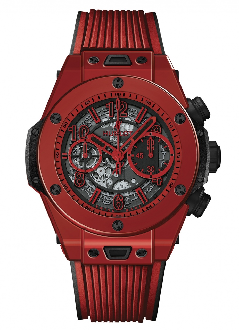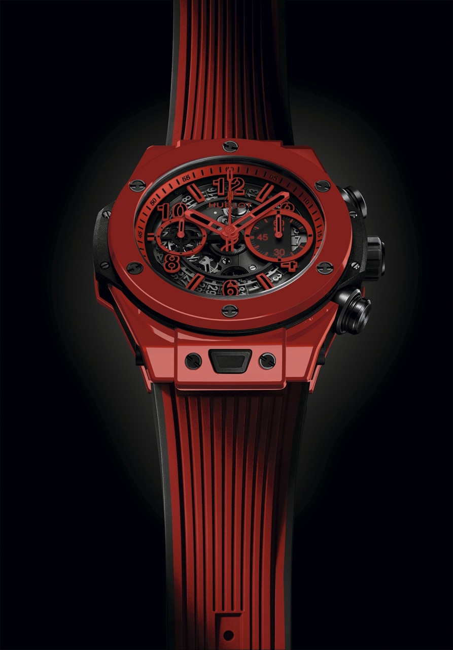 Компания Hublot продолжает удивлять экспериментами в области часовых материалов. Очередное новшество марки – цветная керамика. Разработка технологии, позволяющей получать ультрапрочный сплав керамики (твердость – 1500 HVI) и окрашивать его в любой цвет без сжигания красящего пигмента, заняла 4 года. Первой моделью, на которой компания опробовала новый материал стали часы Big Bang Unico Red Magic.
