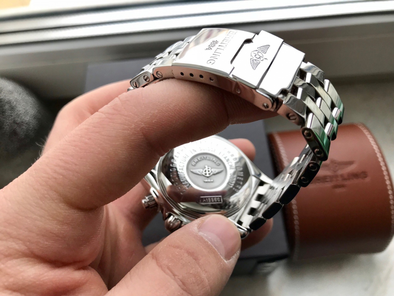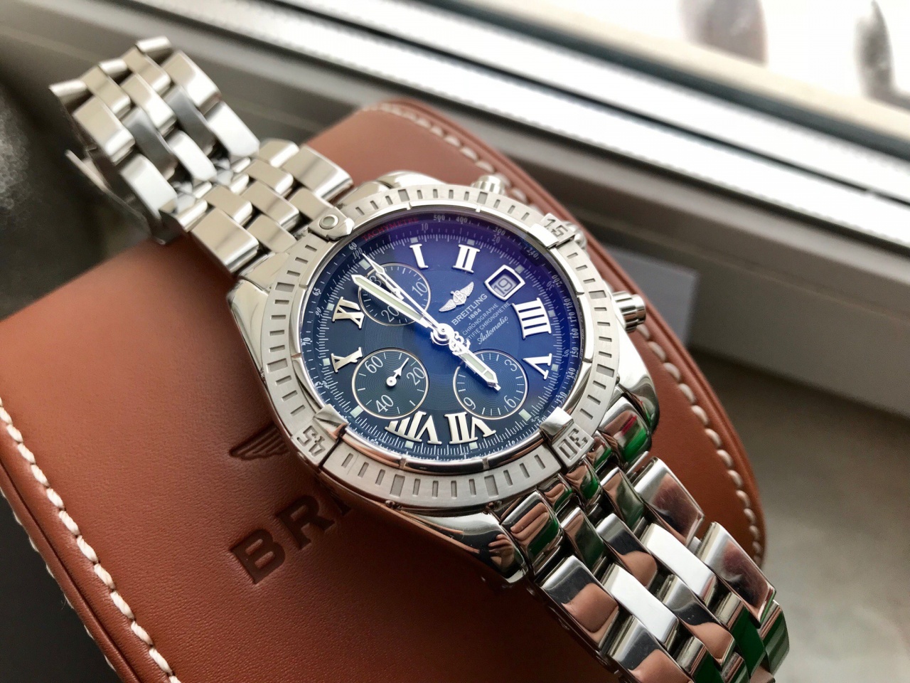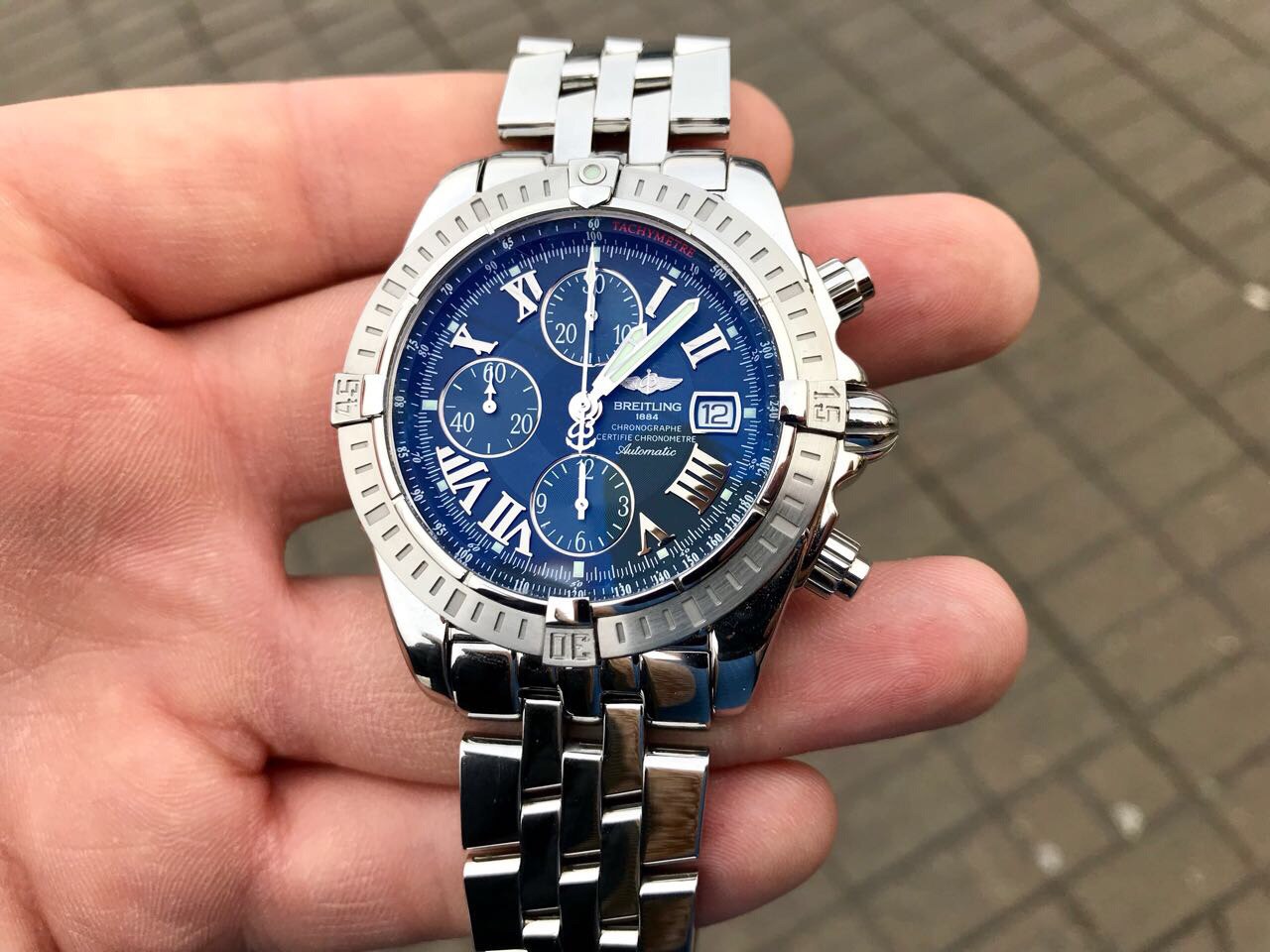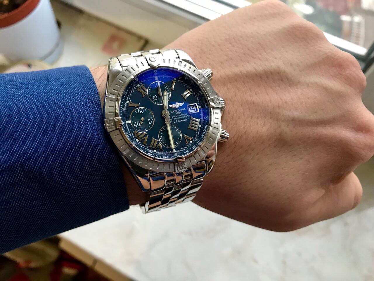 Собственно, модель в представлении не нуждается. Chronomat Evolution в лучшем диаметре 43.7 мм на надёжнейшем Calibre 13 (он же доработанный Valjoux 7750). Водозащита фирменные 300 метров, ярчайший люм, завинчивающиеся фиксаторы на кнопках хронографа. Ритейл 5840 USD