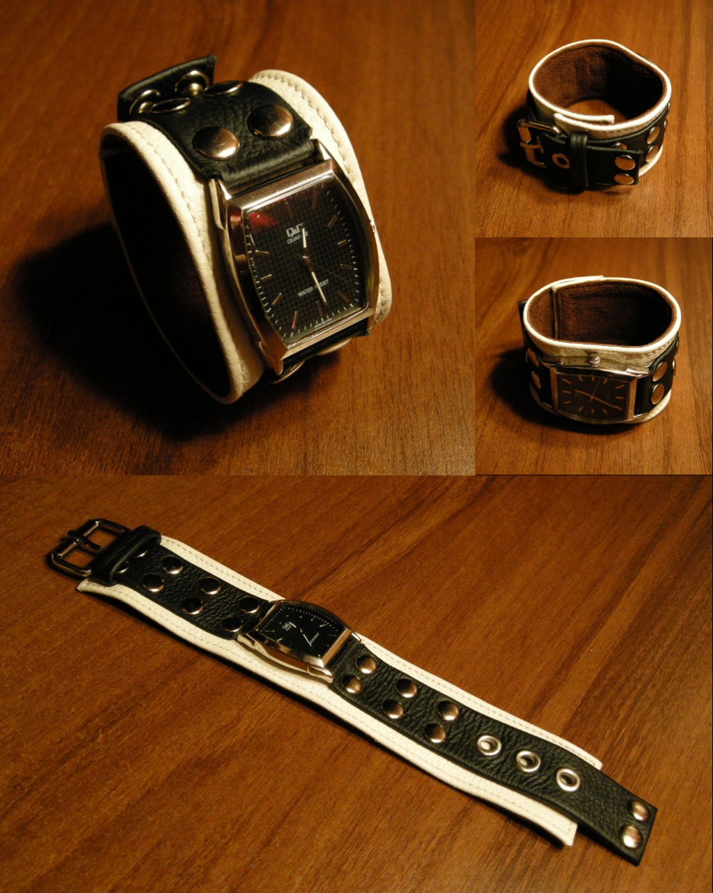 Ширина браслета - 40мм, материал - натуральная кожа чёрного и белого цветов, подкладка - натуральная замша. Браслет очень мягкий и приятный на ощупь. Размер браслета - на небольшую женскую руку, есть 3 отверстия.