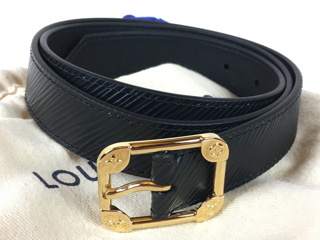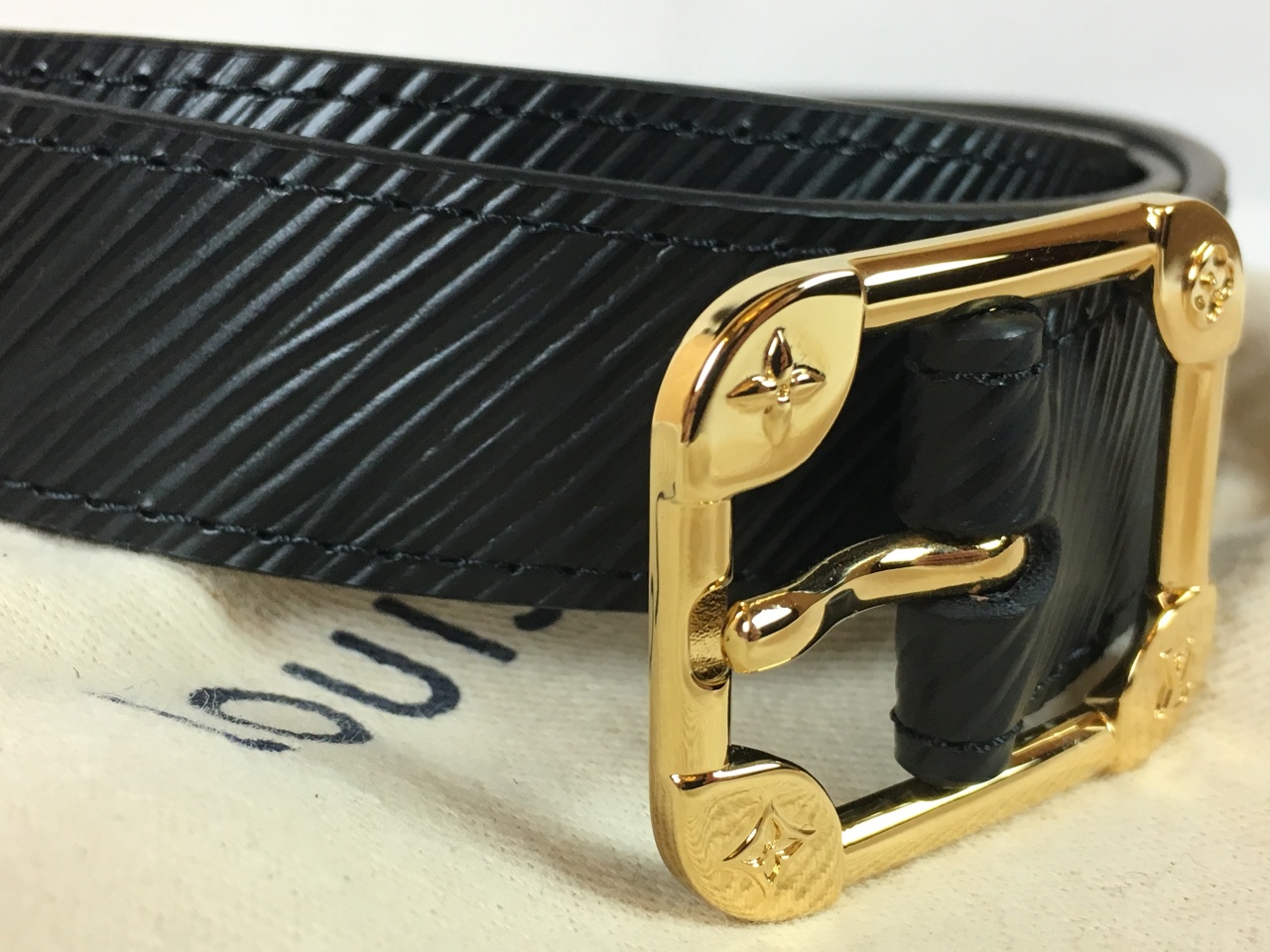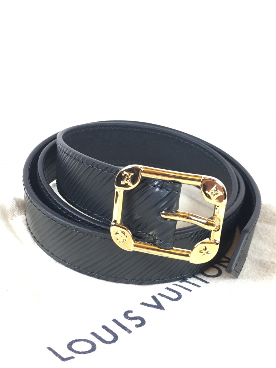 - Квадратная пряжка, напоминающая дизайн исторических сундуков Louis Vuitton