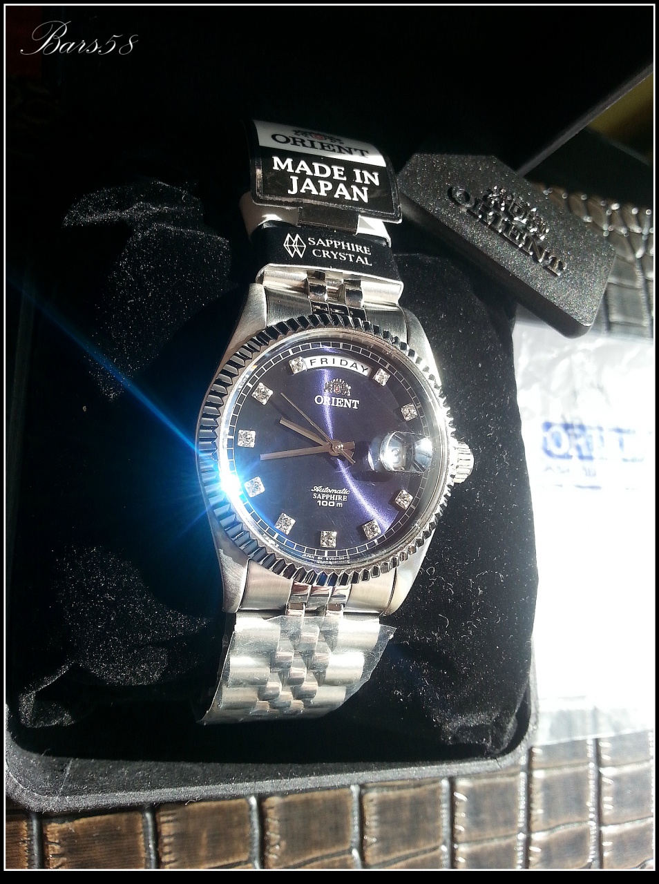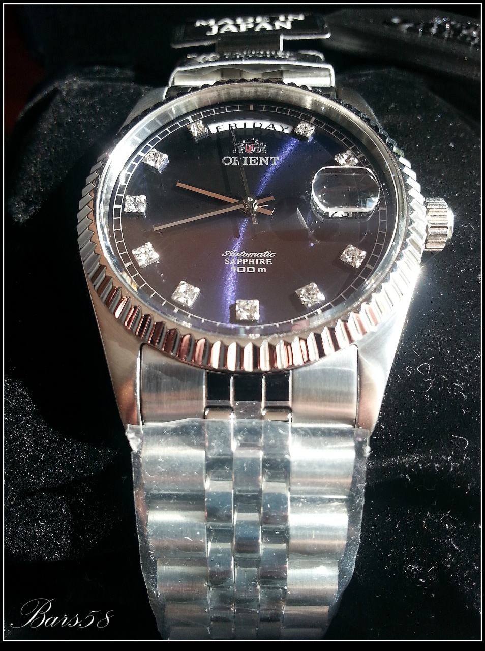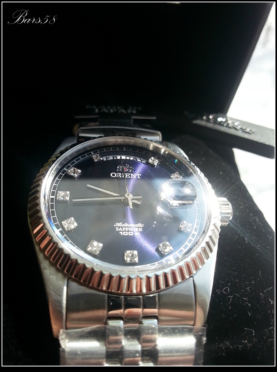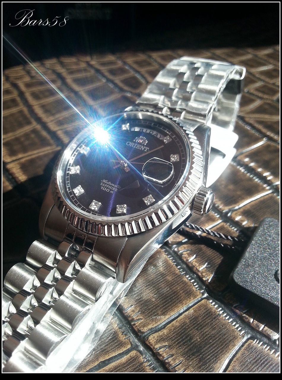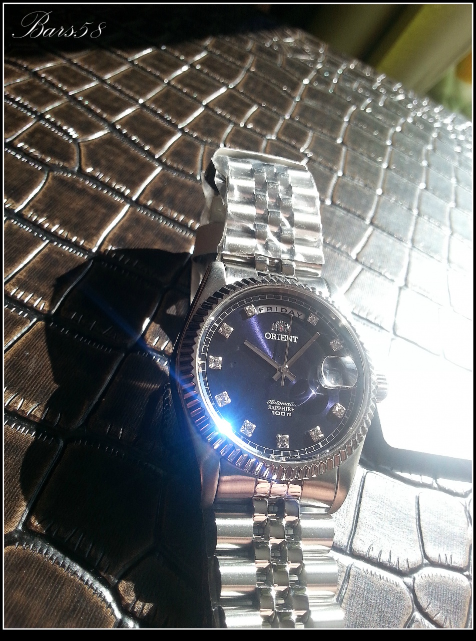 с прекрасным переливающимся тёмно-синим циферблатом и играющими при определённом освещении кристаллами (механика с автоподзаводом) 21 камень, калибр 46E40 (более чем проверенный и надёжный)-показал довольно внушительные результаты по точности и запасу хода, частота колебаний: 21,600 колебаний/час