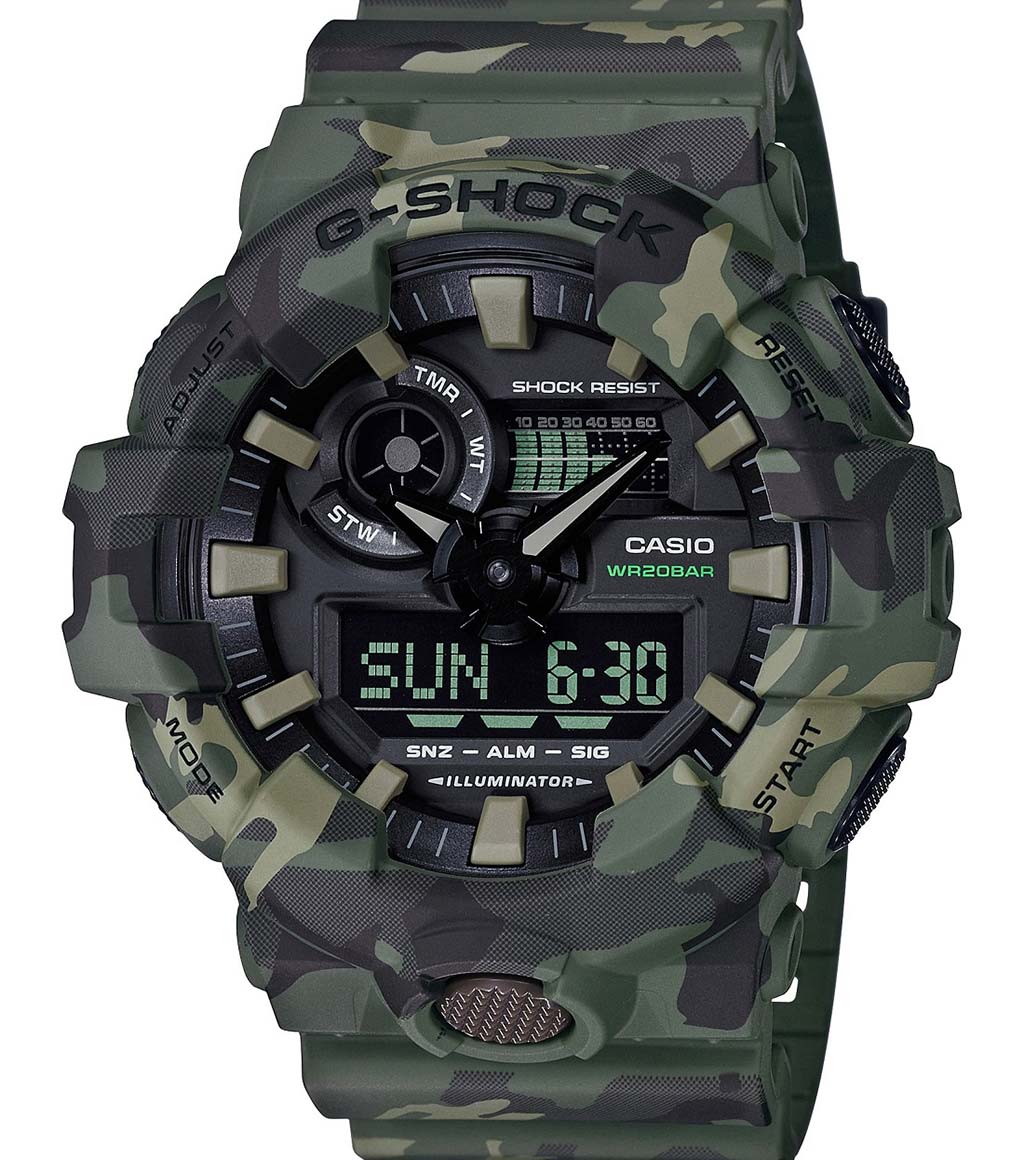 Компания Casio – безоговорочный чемпион в производстве часов для активного отдыха и любителей приключений. Сегодня японский часовой дом запустил под брендом G-Shock новую коллекцию GA700, состоящую из камуфляжных часов. Новинки выполнены в разном цвете и рисунке камуфляжа. Они отличаются типичным для своего класса дизайном и массивным корпусом.