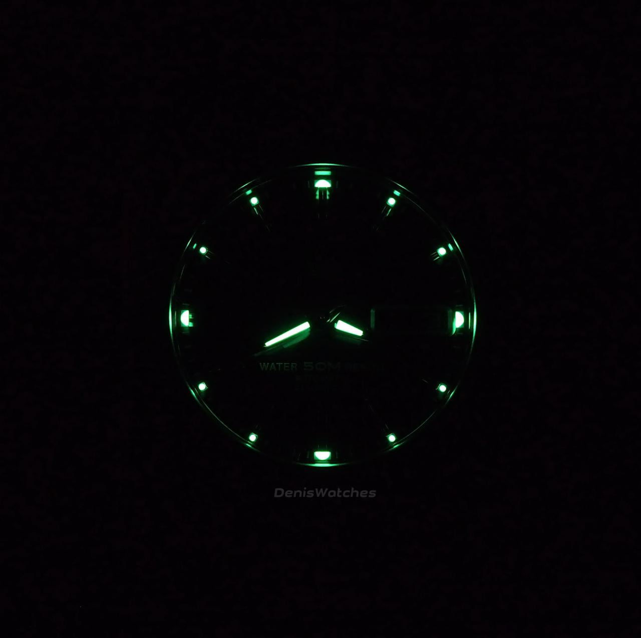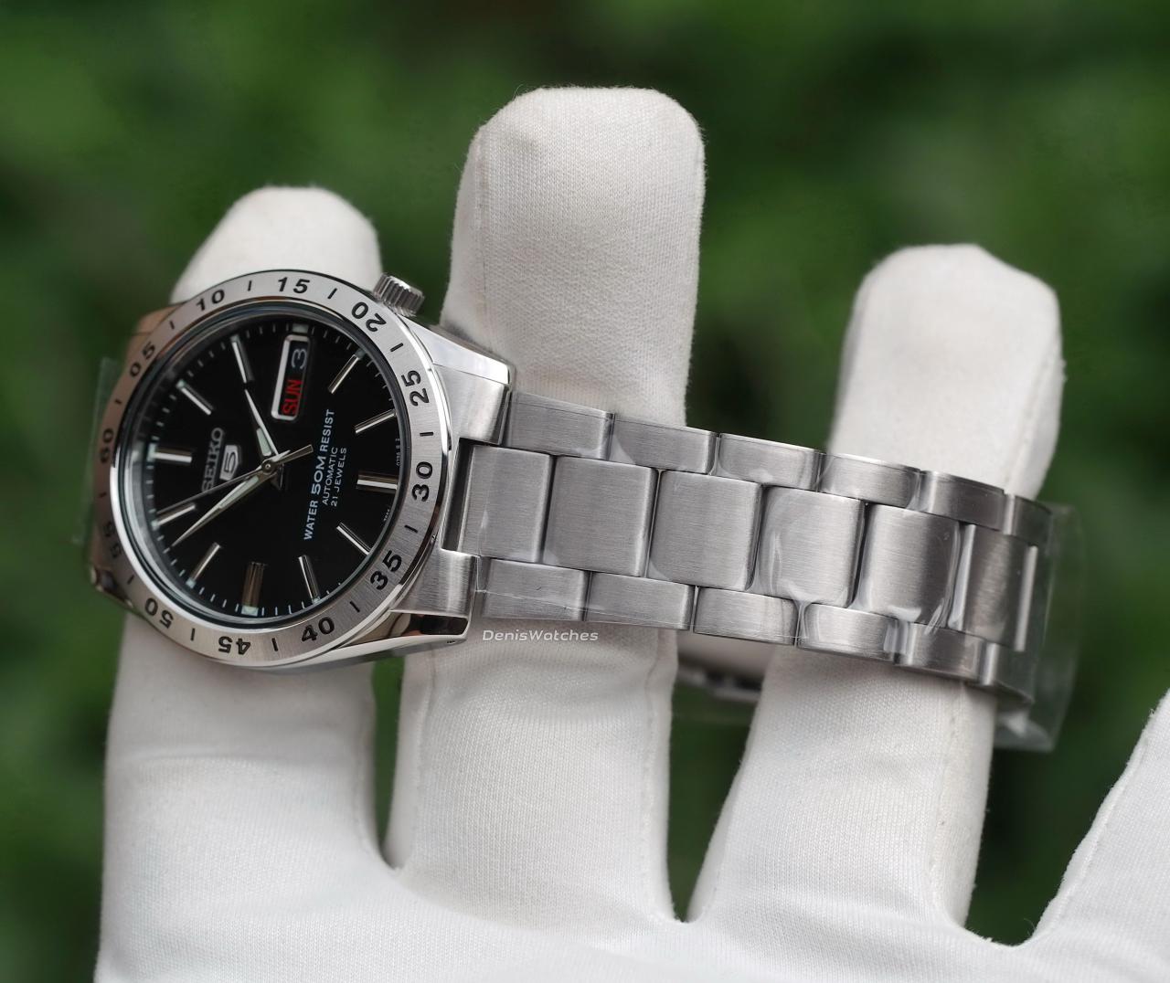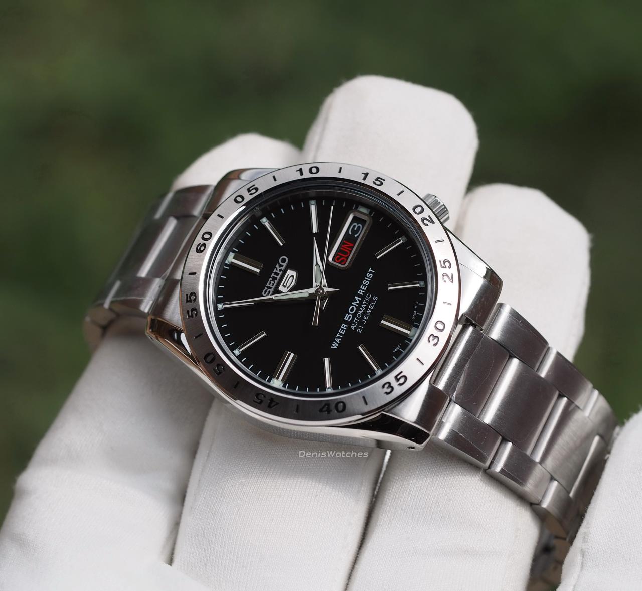 Черный глянцевый циферблат, накладные метки, окантовка даты и лого Seiko 5