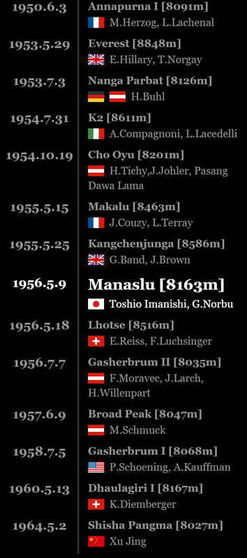 Впервые была покорена в мае 1956 года альпинистам Г.Норбу и Т.Иманиши