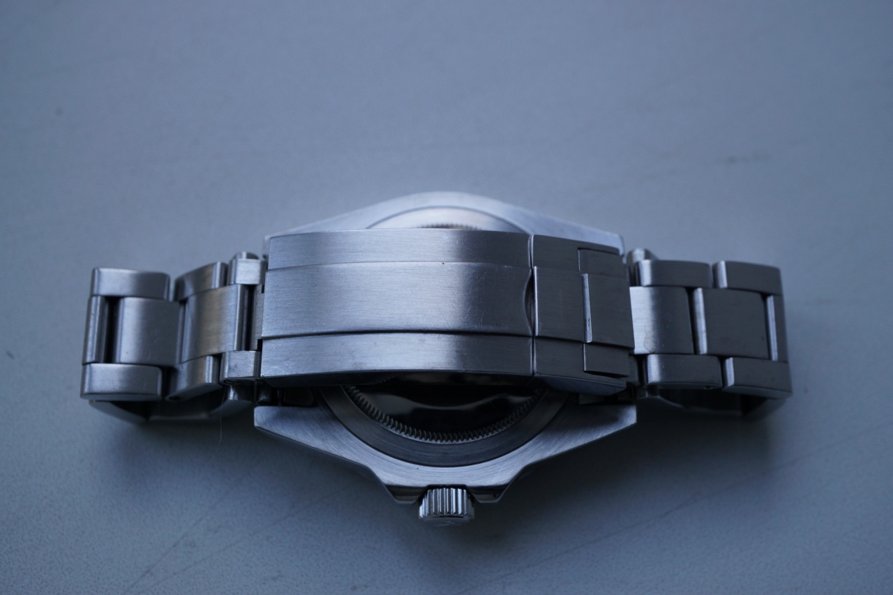дополнительные звенья в комплекте. Ширина браслета - 20 мм. Крепления звеньев между собой - на винтах, элементы браслета - литые. Браслет и застежка сатинированы, на торцевых гранях - полировка. Застежка снабжена системой точной регулировкой, как в прародителе, также имеется дайверская защитная скоба от самопроизвольного раскрывания. Завинчивающаяся заводная головка и крышка, водозащита - 200 м.