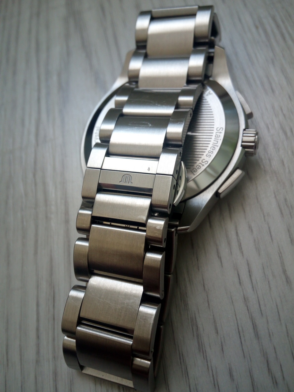 Литой браслет из нержавеющей стали с застежкой, расстегивающейся одним касанием на руку примерно 18см и дополнительно 2 звена и одно полузвено (на фото), в общем примерно на 20,5 см.