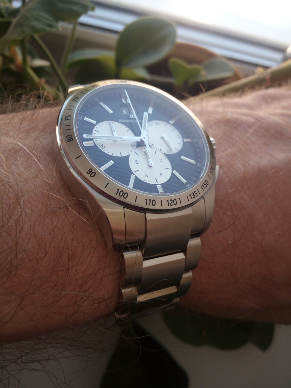 Хронограф с центральной секундной стрелкой, 30-минутным и 10-часовым индикаторами на «9» и «6 часах» соответственно