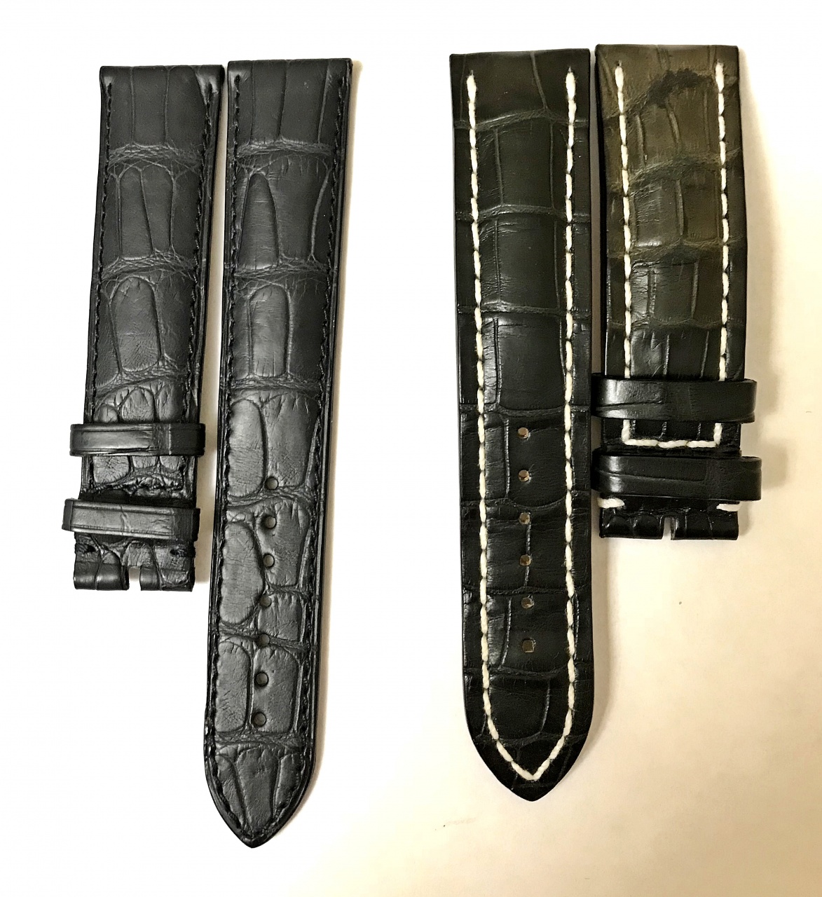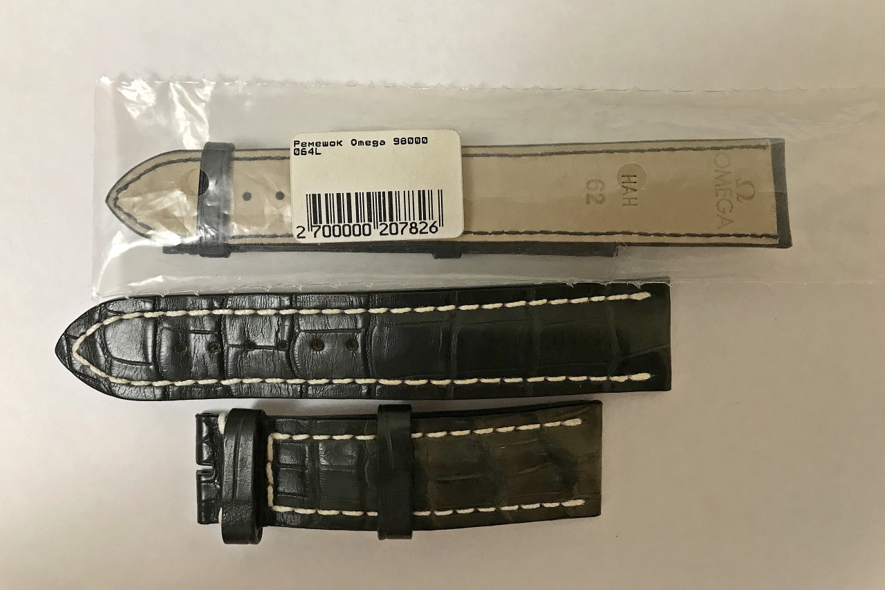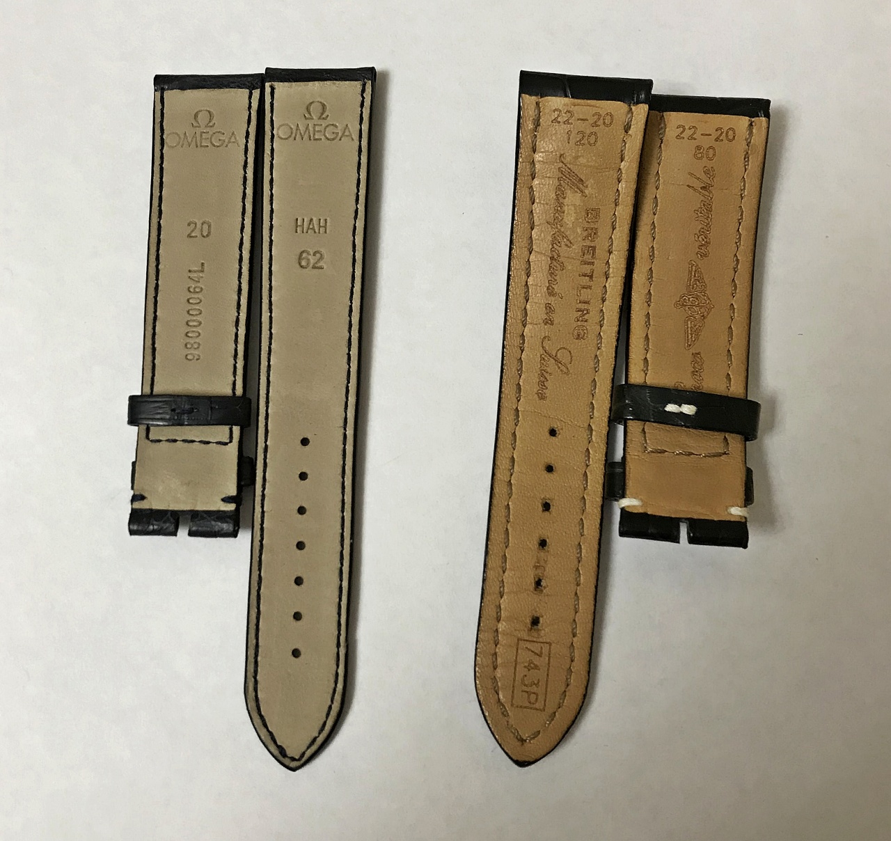 Омега новый, тёмно синий, ближе к чёрному, 20-18мм/80-120. Брайтлинг не ношеный, но стоял на часах(витрина), тёмно- зелёный, 22-20/80-120.