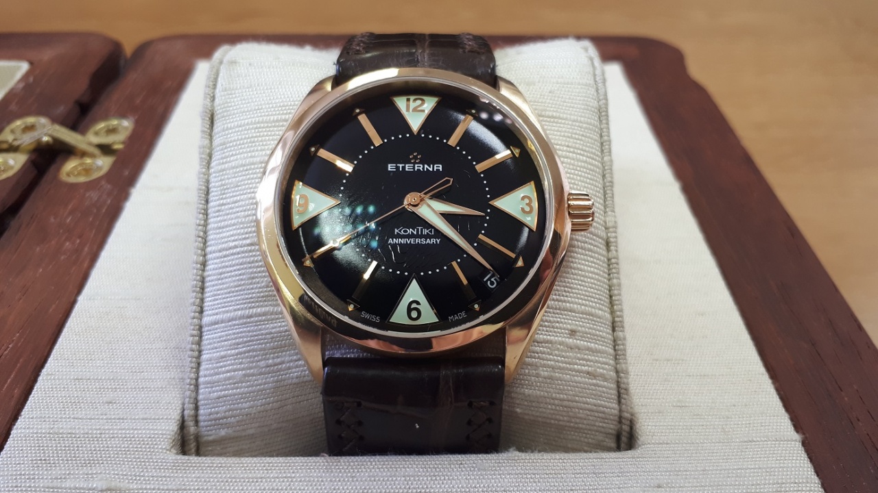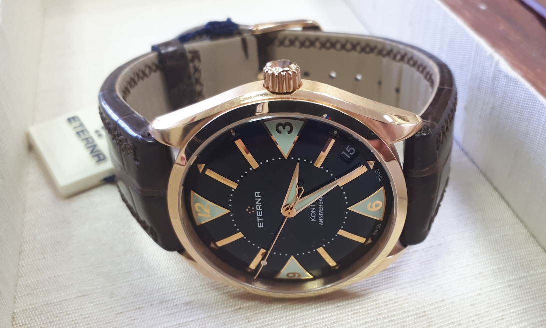 Швейцарские часы серии KonTiki 50 лет тому назад компания Eterna выпустила специально для тихоокеанской экспедиции прославленного норвежского путешественника Тура Хейердала на плоту KonTiki. В честь 50-летия линейки Eterna представляет лимитированные 50 экземплярами часы KonTiki Anniversary в 40-миллиметровом корпусе из розового золота.