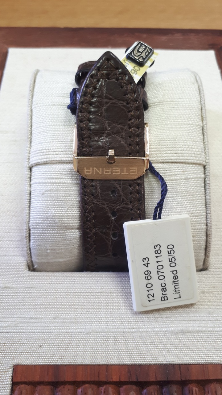 Часы поставляются на коричневом ремешке из кожи аллигатора с простой золотой застежкой в подарочной коробке из красного дерева, выполненной вручную в виде высокой прямоугольной статуи идола.