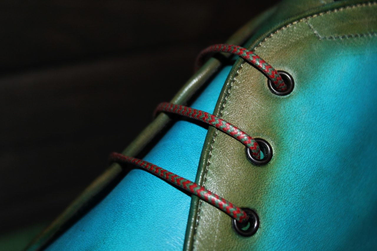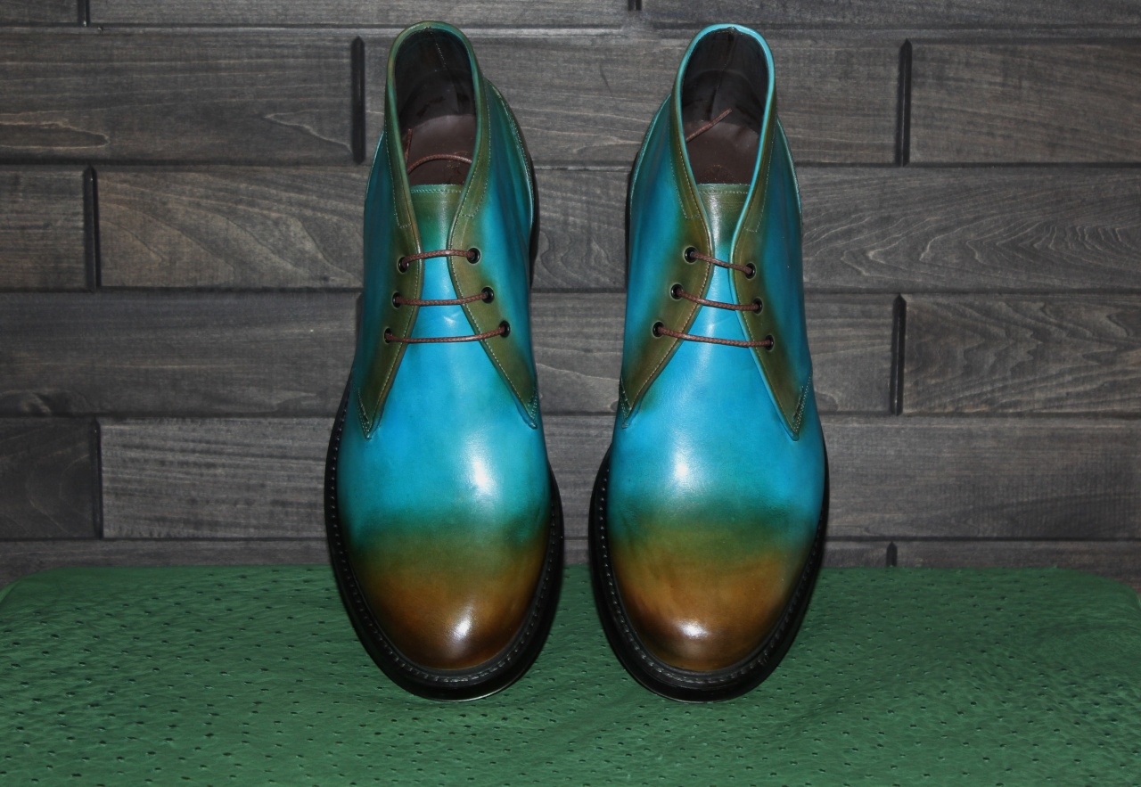 Ботинки изготовлены из 100% телячьей кожи высочайшего качества выделки, имеющей градиентную окраску в «бирюзово-коричневый» цвет, выполненную вручную.