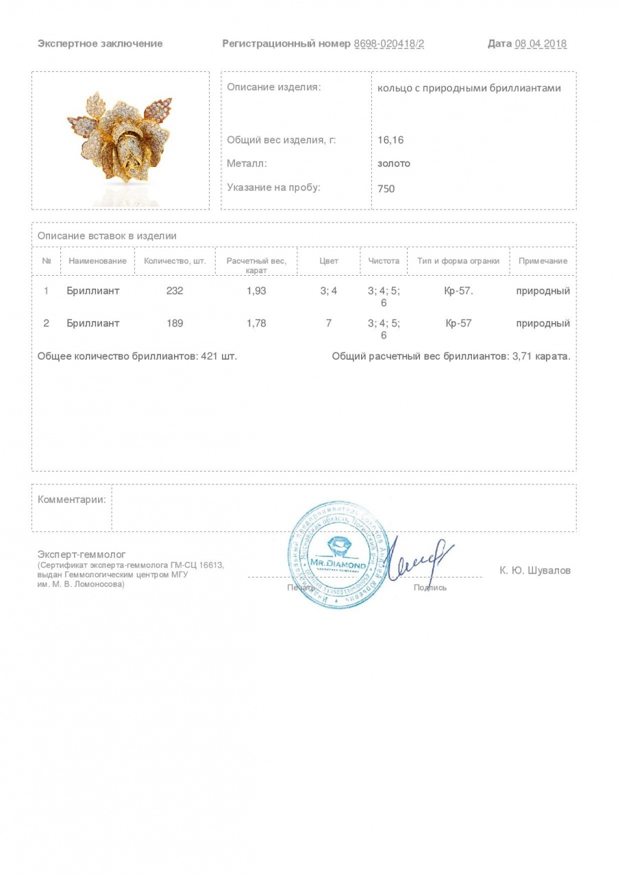 Итальянское золотое кольцо с бриллиантами 3.71ct