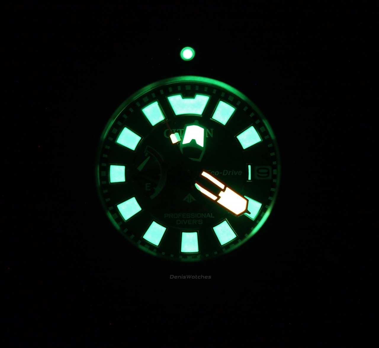 Очень яркий люм зеленого на стрелках и метках, плюс стрелки и метки крупные - светит очень хорошо, так же светится точка на безеле
