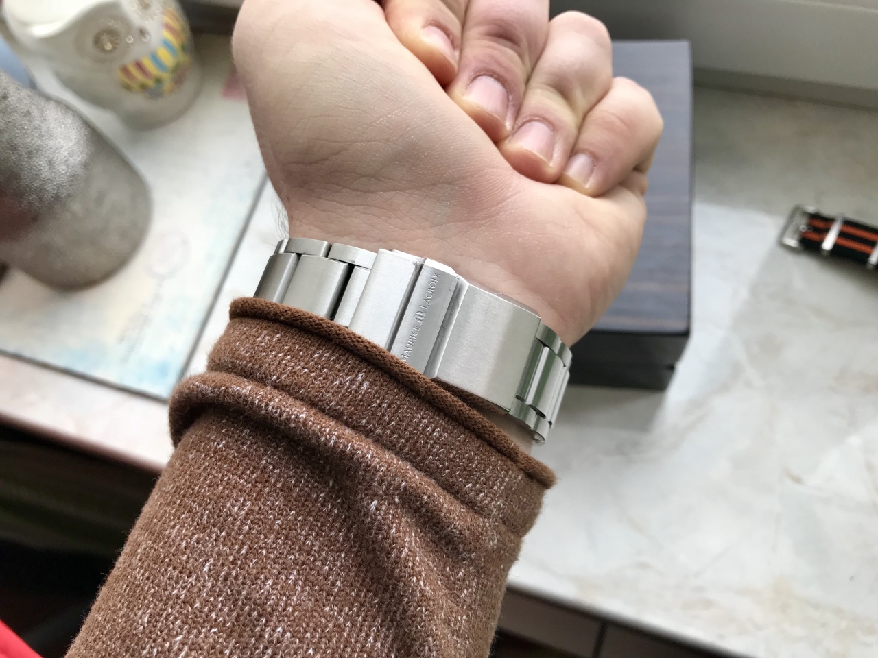 Часы в идеальном состоянии. Куплены в 2014 году. Полнейший комплект с приятным бонусом в виде классного оригинального нейлонового НАТО ремня. Смотрится суперски и очень стильно! Особенно будет актуально летом, под шорты и поло, к примеру. Либо для плавания, ведь нейлон очень быстро сохнет. Цена новых в бутике 4500$! И это не раздутый ритйл, как часто бывает. В салонах России действительно увидите прайс 240 000 руб.