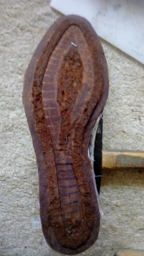 11. Готовим затяжную стельку, вырезаем с чепрака или воротка 2,5-3,5 кусок по контуру следа колодки с припуском около 1-1,5 см, хорошо смачиваем и провяливаем, размещаем по следу колодки и натягиваем хорошо фиксируя гвоздиками по контуру и в центре и обстукиваем. Ждём какое то время пока высохнет.