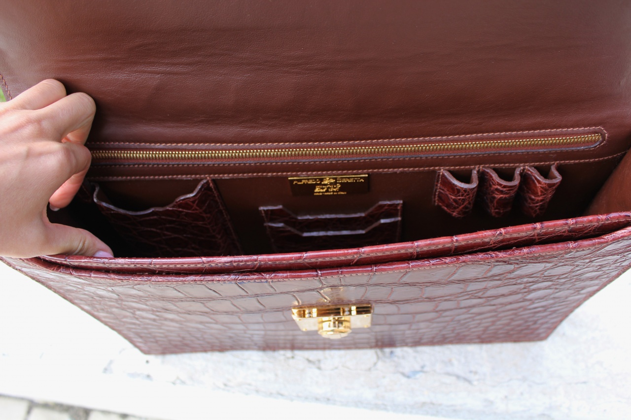 Внутренняя часть портфеля изготовлена из 100% телячьей кожи коричневого цвета, с отделкой из кожи крокодила, и имеет одно основное, большое отделение для переноски документов, ноутбука и прочих вещей, одно дополнительное отделение, застегивающееся на молнию с бегунком из кожи крокодила, кармашки для хранения 3 ручек, смартфона, визитных карточек, изготовленные из кожи крокодила, и второе отделение меньшего формата для документов или планшетного компьютера типа iPad.
