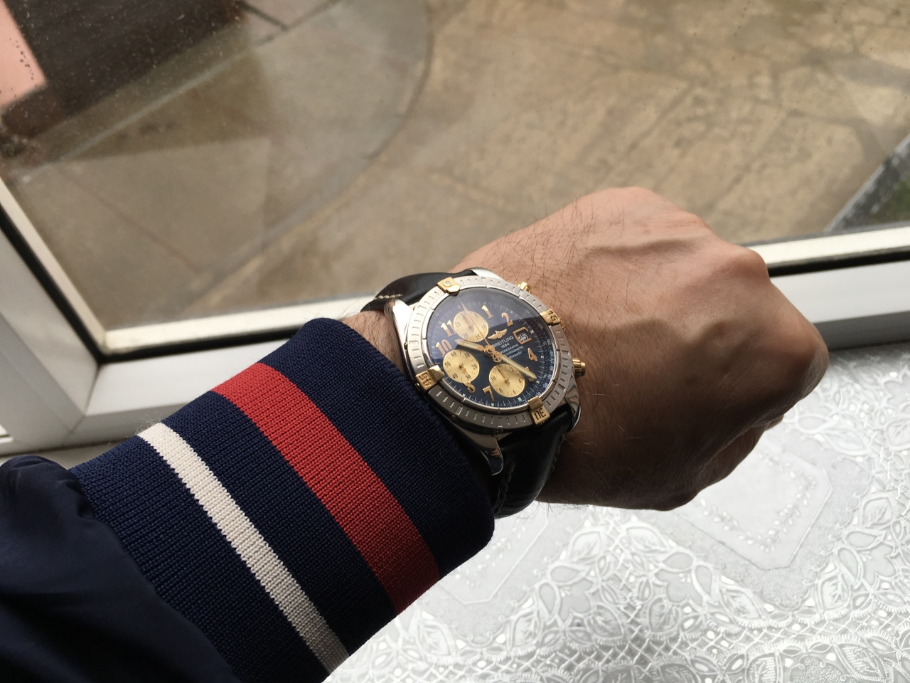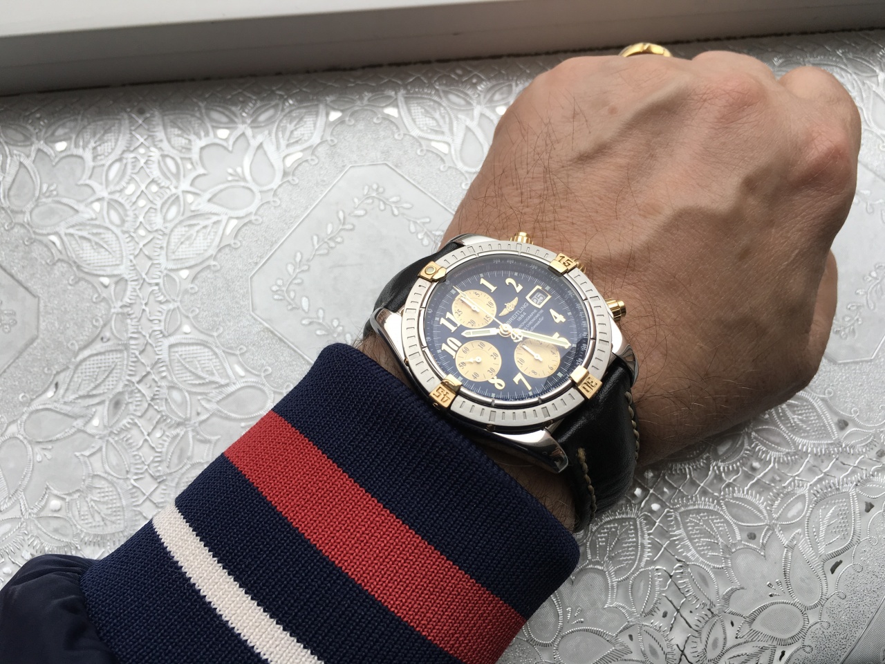 Циферблат - с накладными арабскими цифрами из золота, стрелки - золото, "колодцы" хронографа - золото.