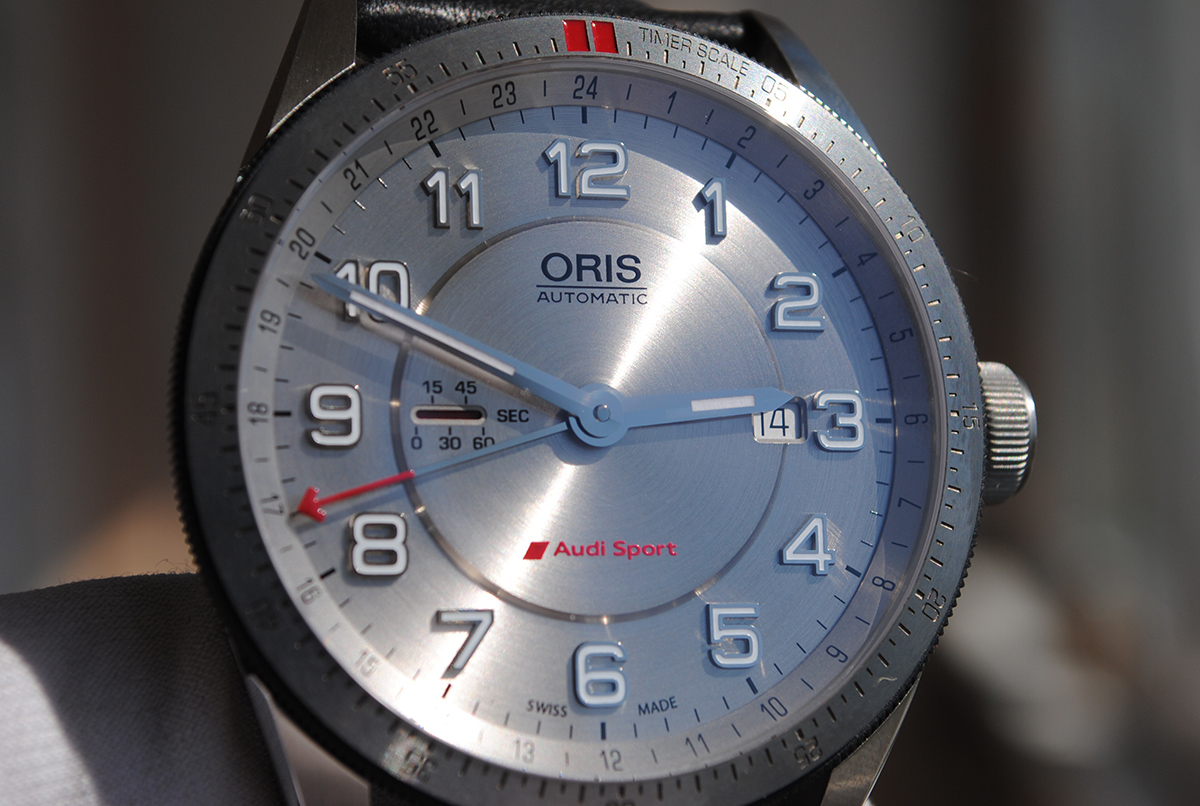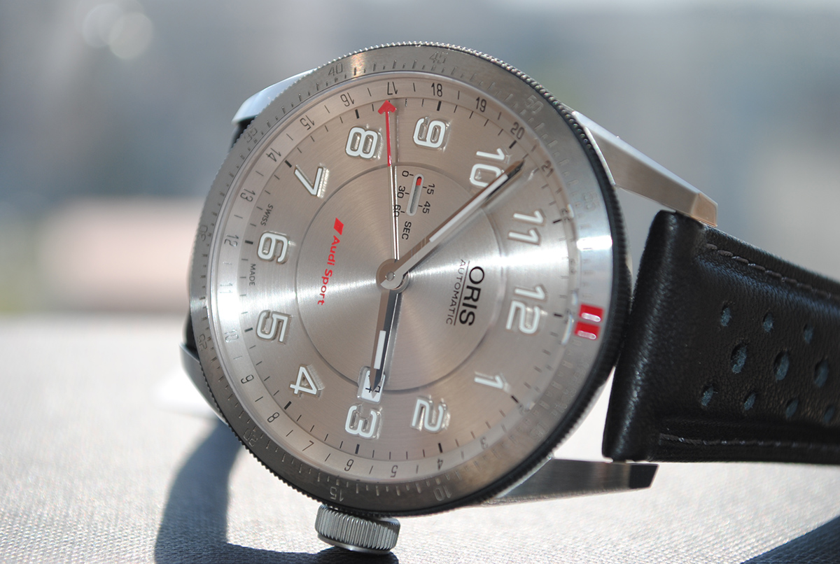 автоподзавод, второй часовой пояс GMT, маленькая секундная стрелка (Разработано компанией Oris), дата, двунаправленно вращающийся красный ротор
