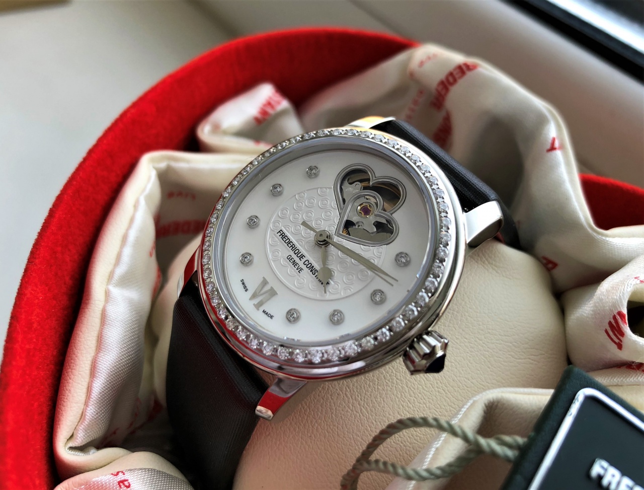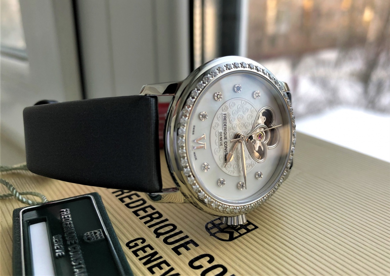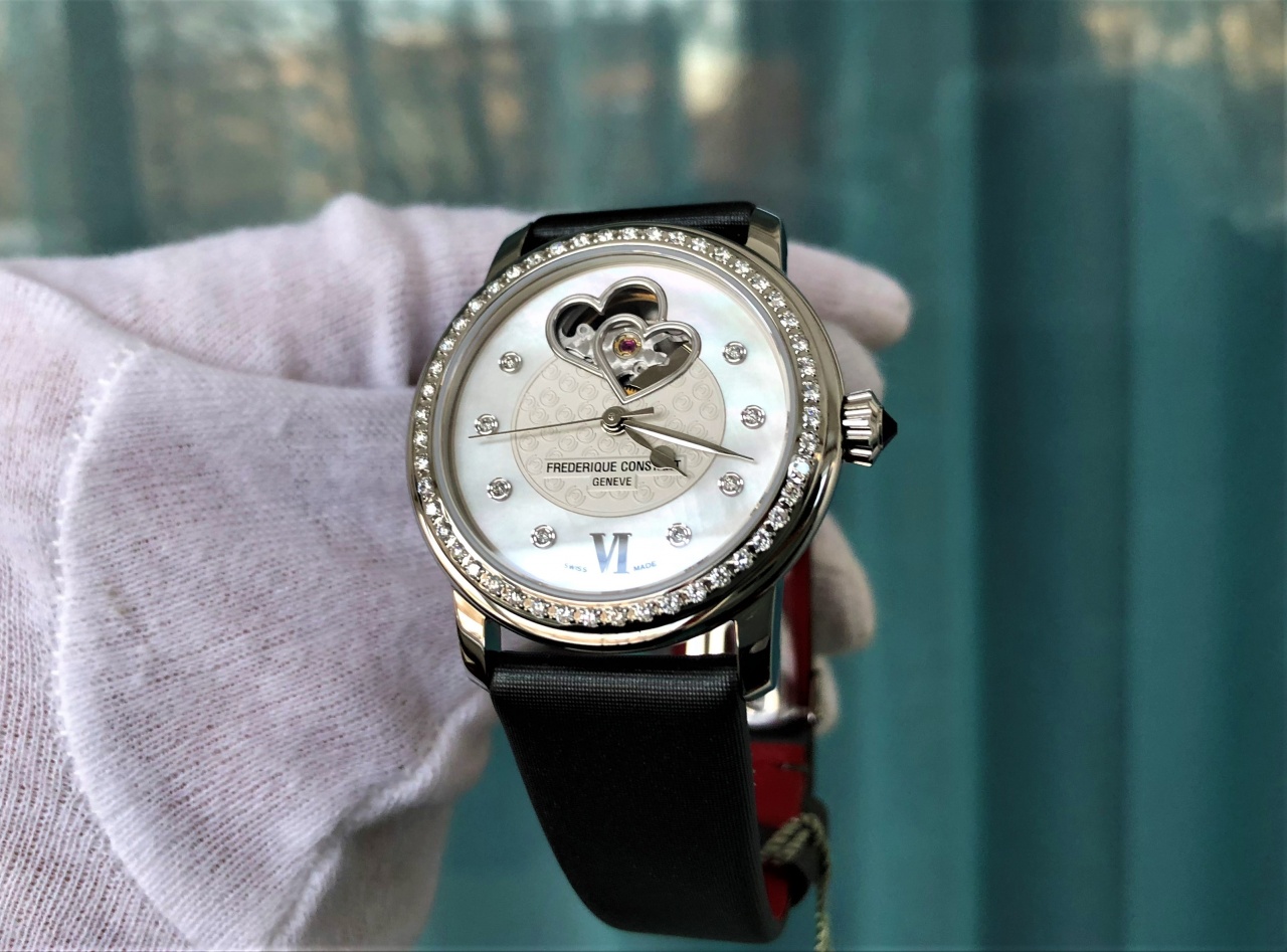 Открытый баланс хода в виде двух соединяющихся сердец, россыпь бриллиантов, элегантный черный сатиновый ремешок.